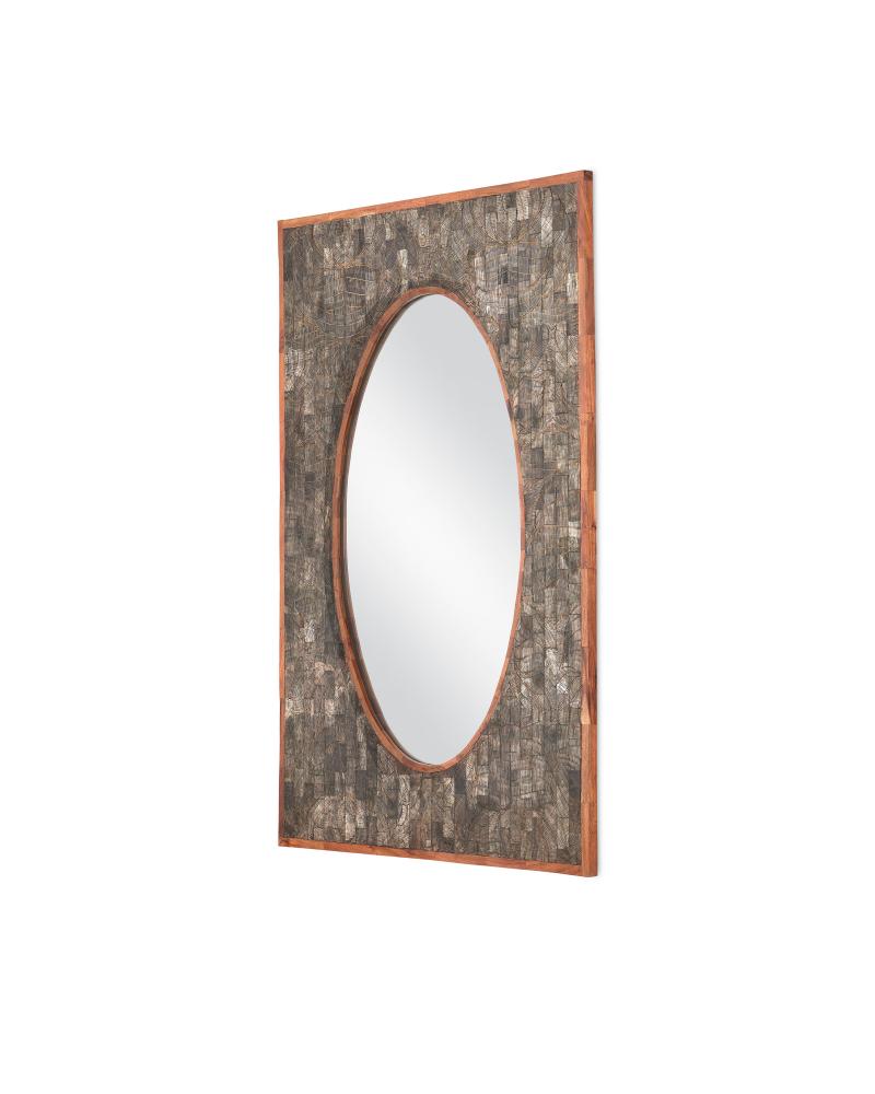 The pattern on the Ebba Rectangular Mirror is fascinating given it is achieved in layers. The exterior and interior wood elements are fastened to the piece and then a pattern of horn is inset into them. Once the pieces of natural material are put in place, the horn is accentuated with a decorative motif before it is chiseled to create an incredible texture. This requires a tremendous amount of handwork, particularly because the pattern is book-matched. There are two cleats so this rectangular decorative mirror can be hung vertically or horizontally.