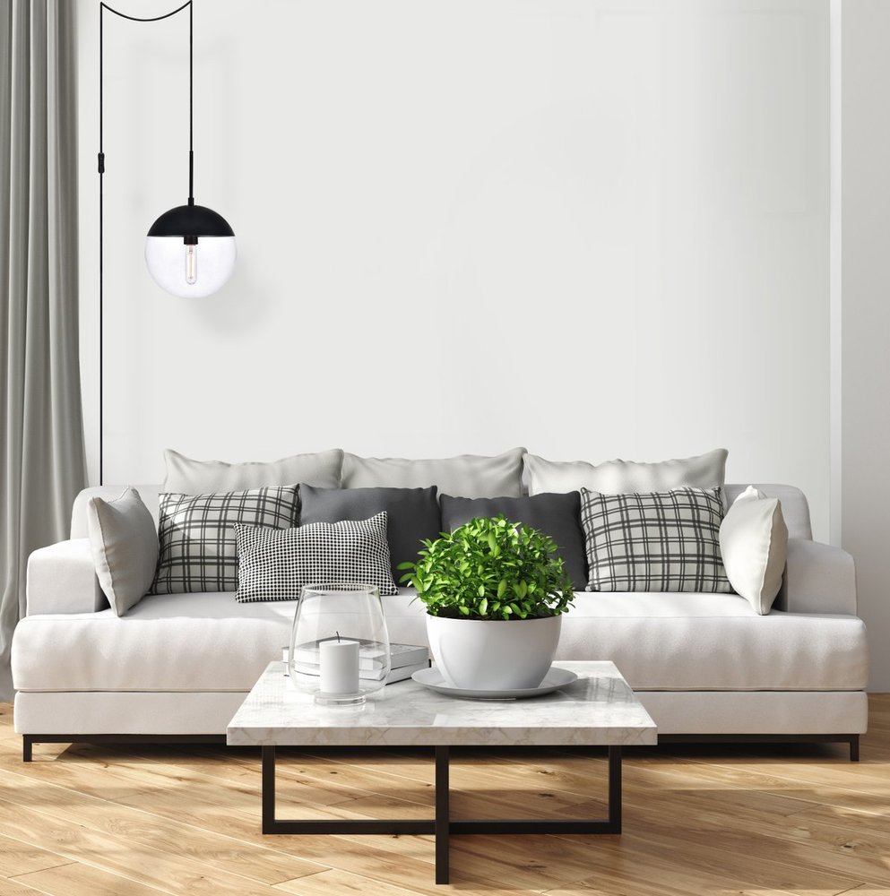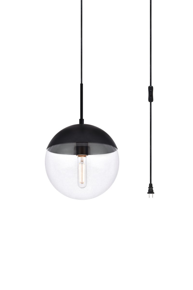 Refined style with a practical design, Eclipse plug in pendant lamps bring cosmopolitan sophistication anywhere, especially to an entryway, office, bathroom, bedroom, or kitchen. The smooth iron round frame comes in a black finish. A 15 foot black cord allows you to vary the hanging height off the swag hooks. Since this is a plug-in you can move it around easily to add light wherever you go. A touch of color on top of the clear spherical glass shade brings character to this classic style. Living in the big city has never been this easy. Simply hang this piece on the provided swag hooks and plug it in for an effortlessly easy installation - can be hung from a sloped or vaulted ceiling.