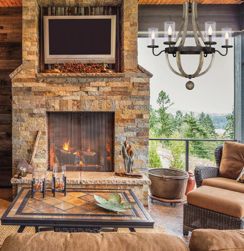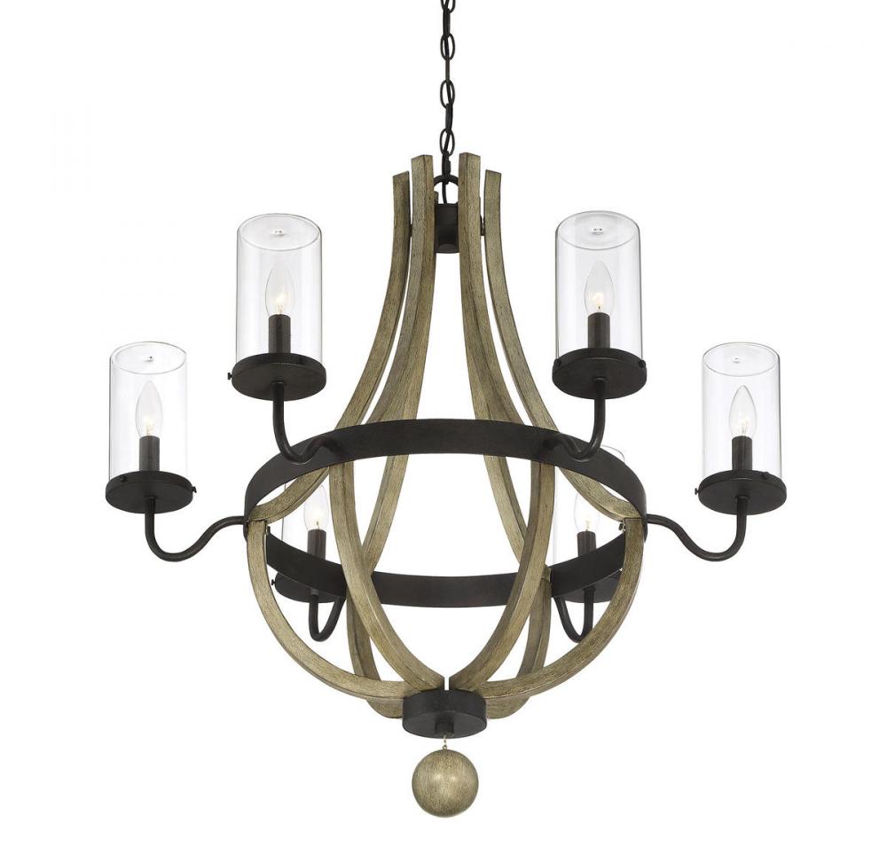Looking for high end outdoor lighting to help turn a porch or patio into a beautiful exterior living space? The Eden 6-light outdoor chandelier from Savoy House is a great choice. This gorgeous exterior light fixture features a gently curving metal frame coated with a Weathervane finish to give it a wonderfully rustic wood look. A band of dark metal encircles the frame, and six metal candleholders hold candelabra bulbs that shine within clear glass cylinders. A single finial, also finished in Weathervane, completes the simple yet striking design. This damp area rated garden chandelier is built to withstand the elements when enjoyed in a covered area. It’s the ideal outdoor porch lighting for spaces featuring rustic and transitional décors.