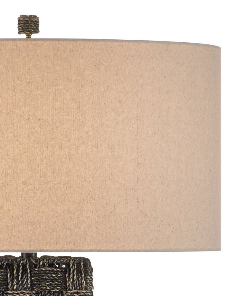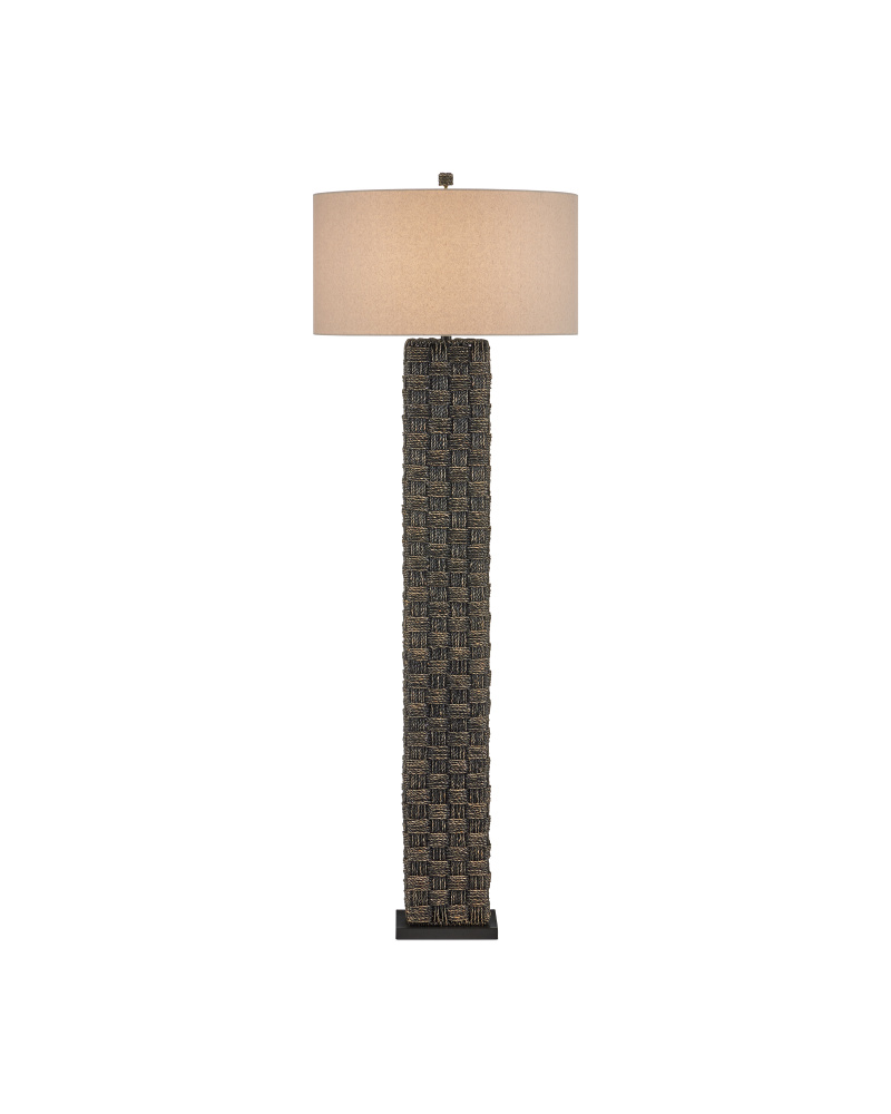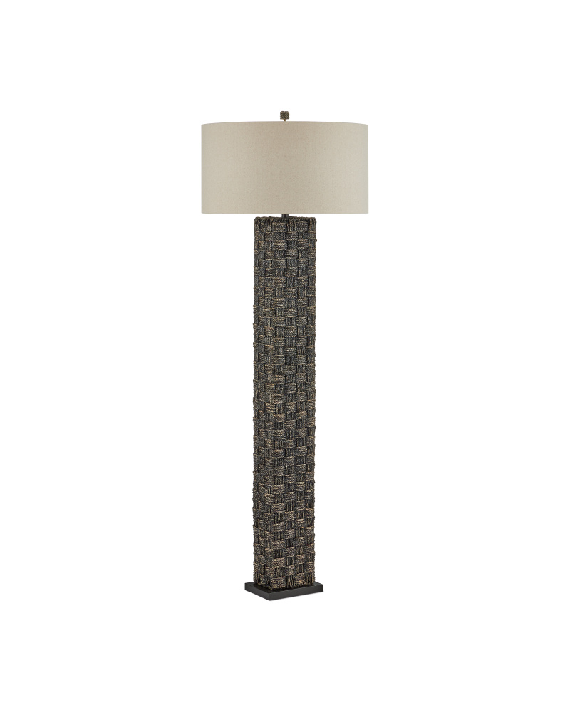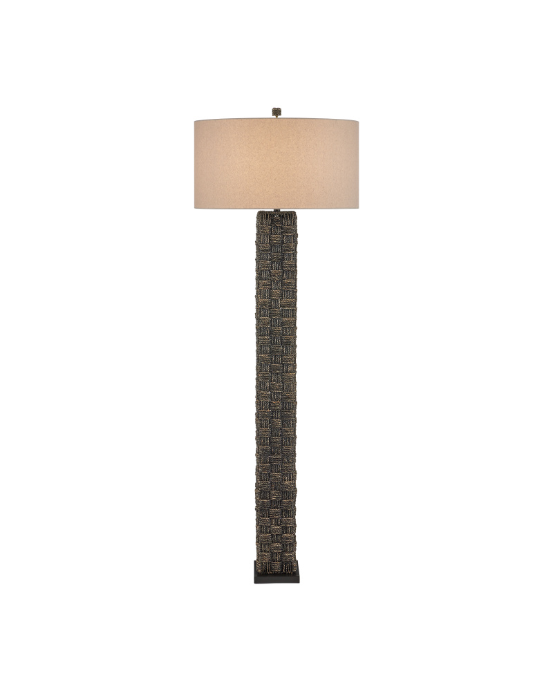 The Eden Floor Lamp has a tall rectangular column made of seagrass that has been twisted, painted black, and woven into an gingham pattern—all of the steps achieved by hand by artisans. The heavily textured surfaces flow up from a minimal wood base, also painted black. The lamp is topped with a linen drum shade that draws out the lighter tones in the natural material, which is fastened by a finial that is also covered in matching seagrass.