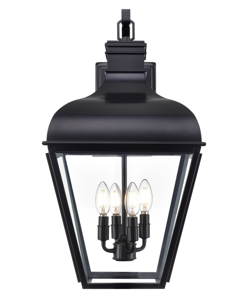 Elegant Edwardian-style gas lamps are reimagined with the Edenton Family of outdoor lighting. Available as 2-, 3-, and 4-light lanterns, the fixtures are finished in durable powder coat black and suspended on traditional barn-style joists cantilevering out from the wall for a look of architectural distinction. Whether flanking the entryway, or illuminating walkways or the deck, these refined fixtures make a tasteful design statement.