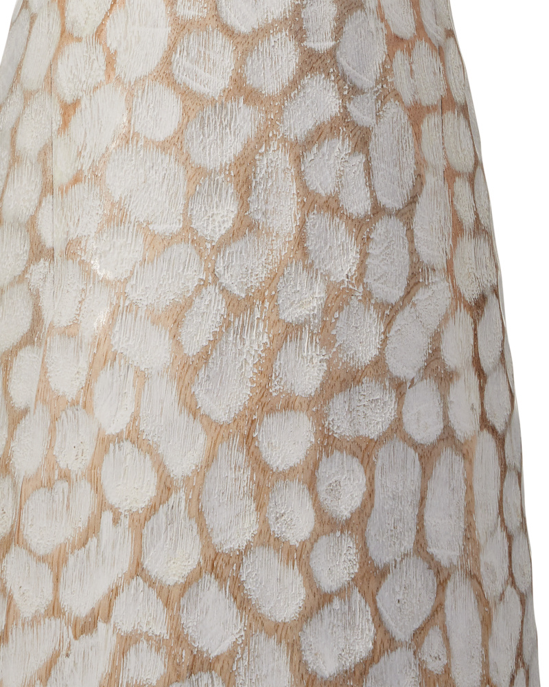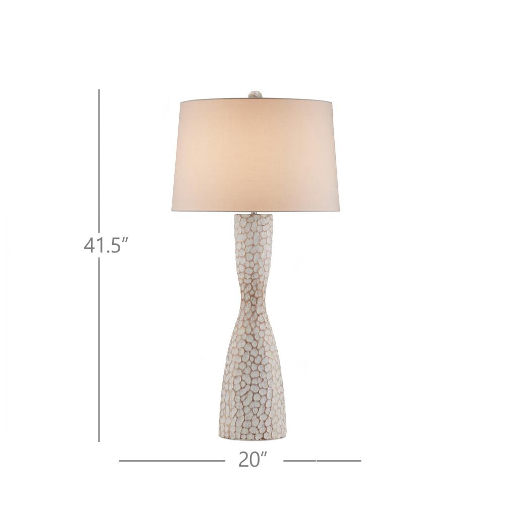 The Edwell Whitewash Table Lamp has a shapely body that has been hand-carved from wood to create a textural pattern, the organic shapes bringing the slim hourglass form a dynamic interest. The pattern is accentuated when the whitewash finish gathers in the crevices on the lamp and is wiped clean on the peaks that swim along the surface. A design detail is the finial that has been hand-carved and finished to match the lamp's body.