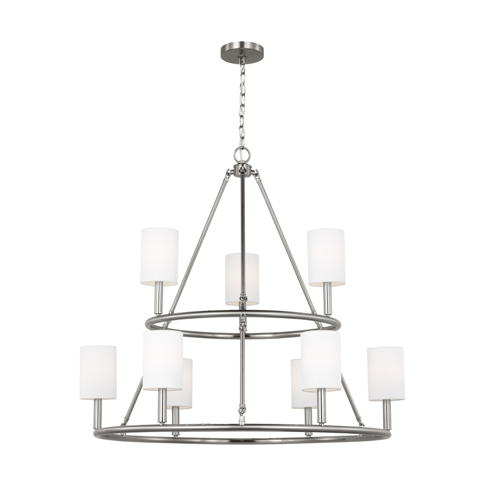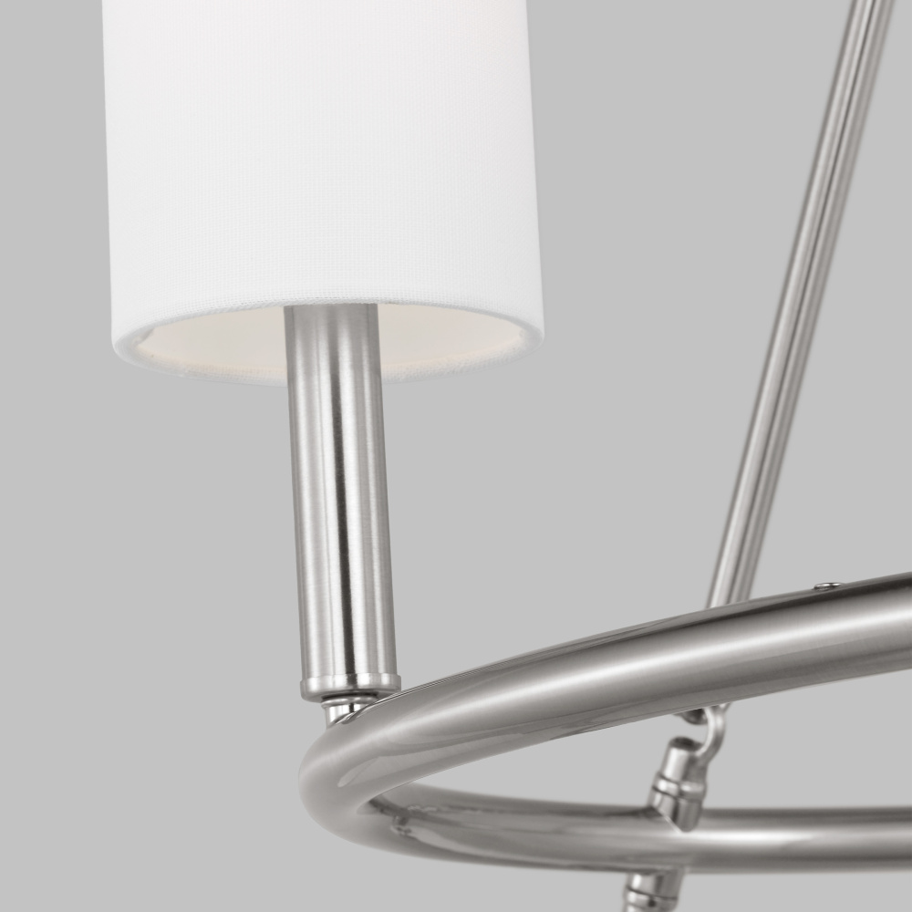 Designed by Drew & Jonathan Scott, Egmont is a classic design with clean lines and white linen shades, perfect for farmhouse or transitional style settings. It's made from metal featuring a wagon wheel body on the chandelier and a circular backplate on the wall sconce. The open framework at the top and bottom assures strong up-light. The overall style and multiple finishes work as well in a modern-farmhouse kitchen as they do in a vintage industrial loft.