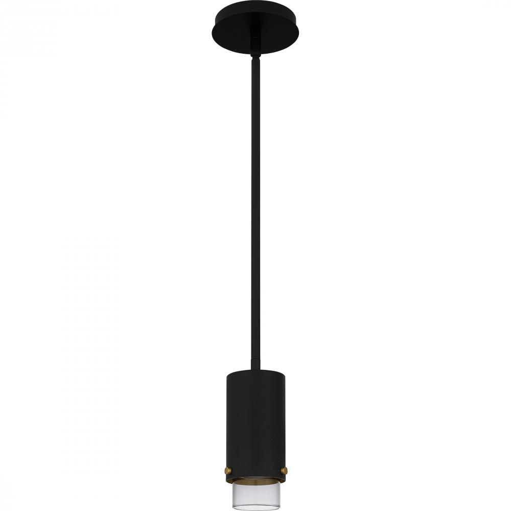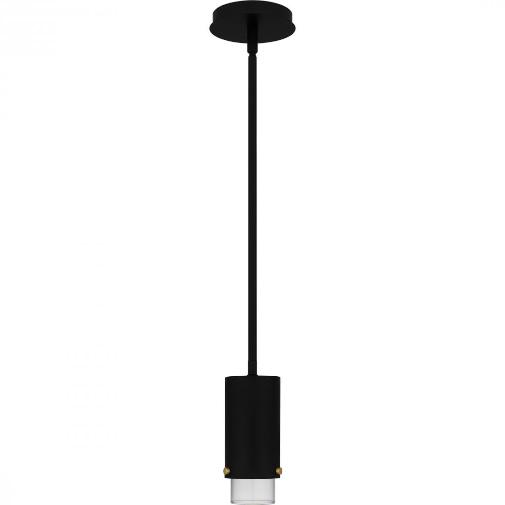 Eilo mini pendants illuminate modern industrial style with a matte black and gold palette. The outer matte black shade features a subtle pattern for added depth and texture, while the inner clear glass shade adds contrast and shine.