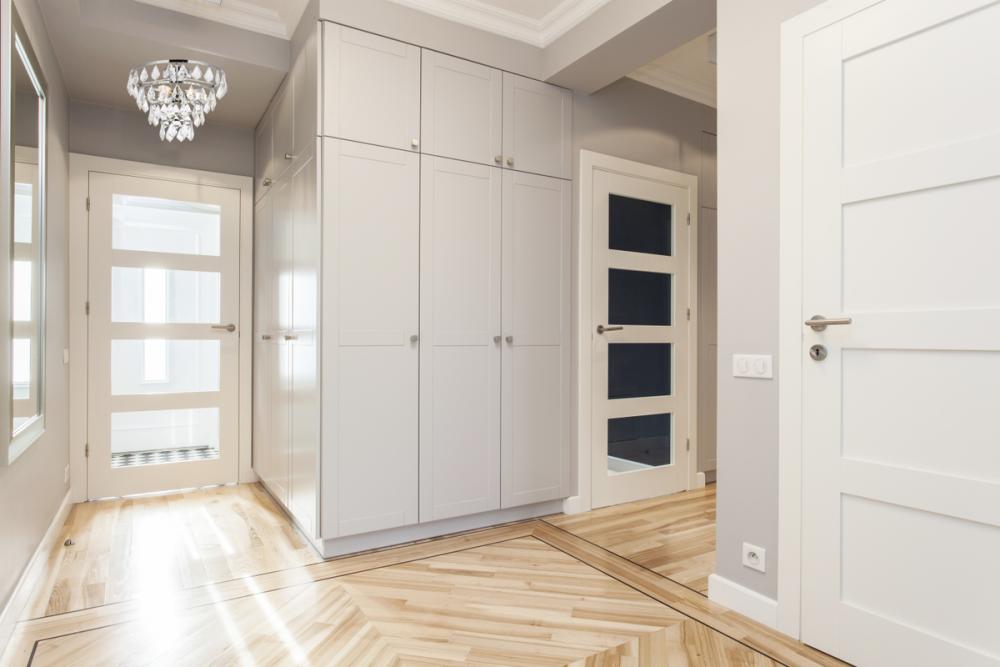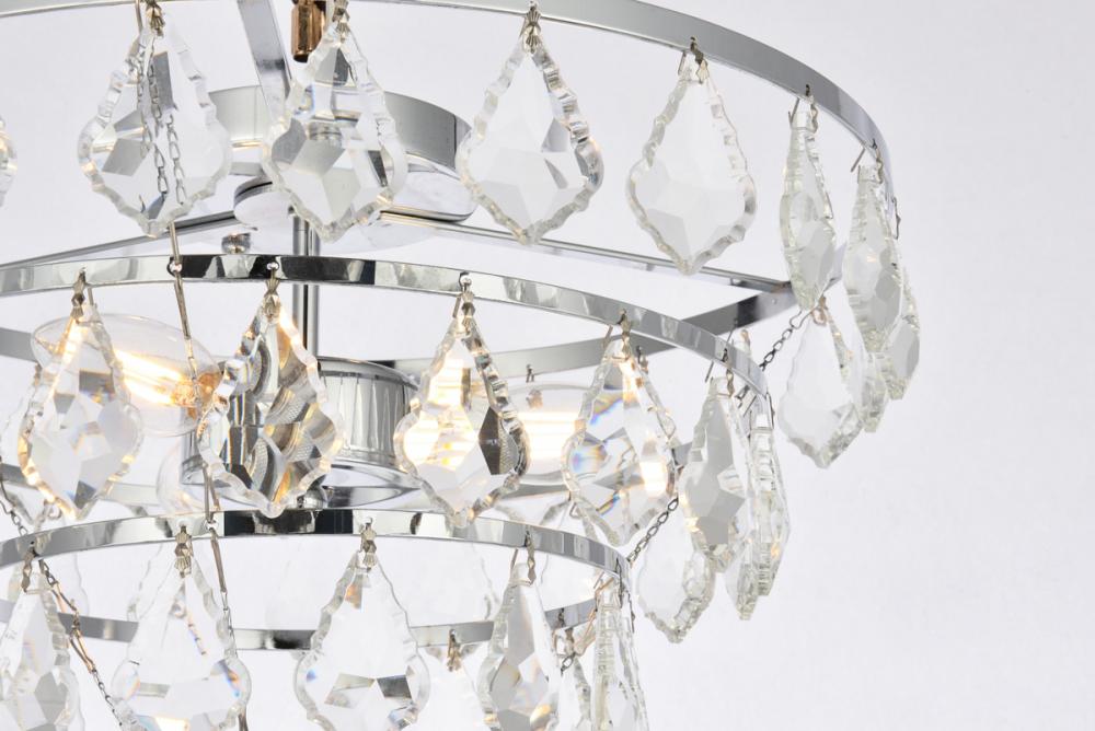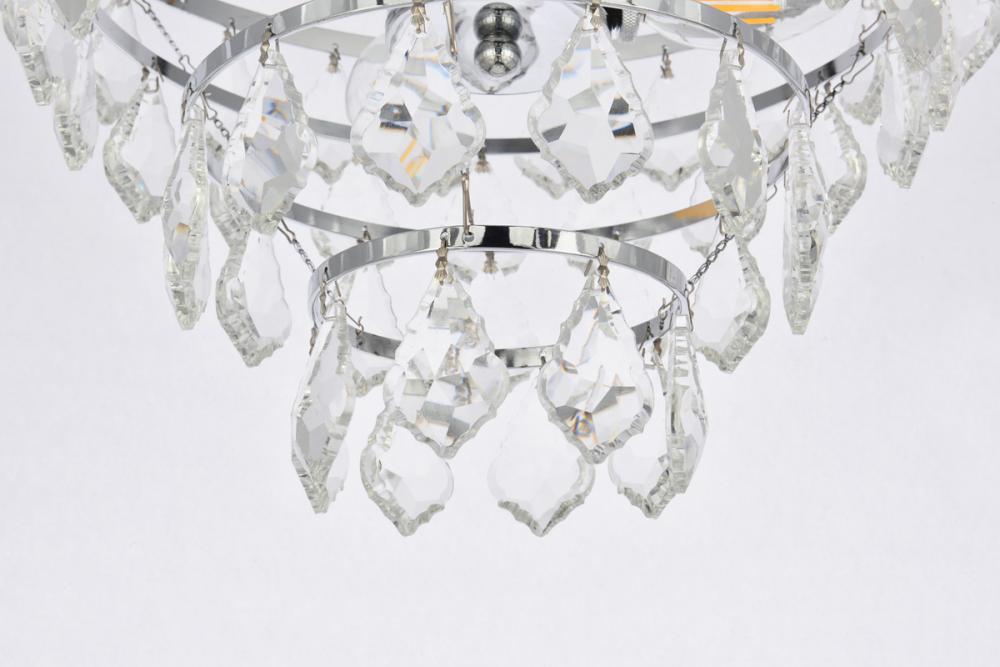 Tiers of clear multi-faceted crystals reflect the soft glow of candelabra bulbs