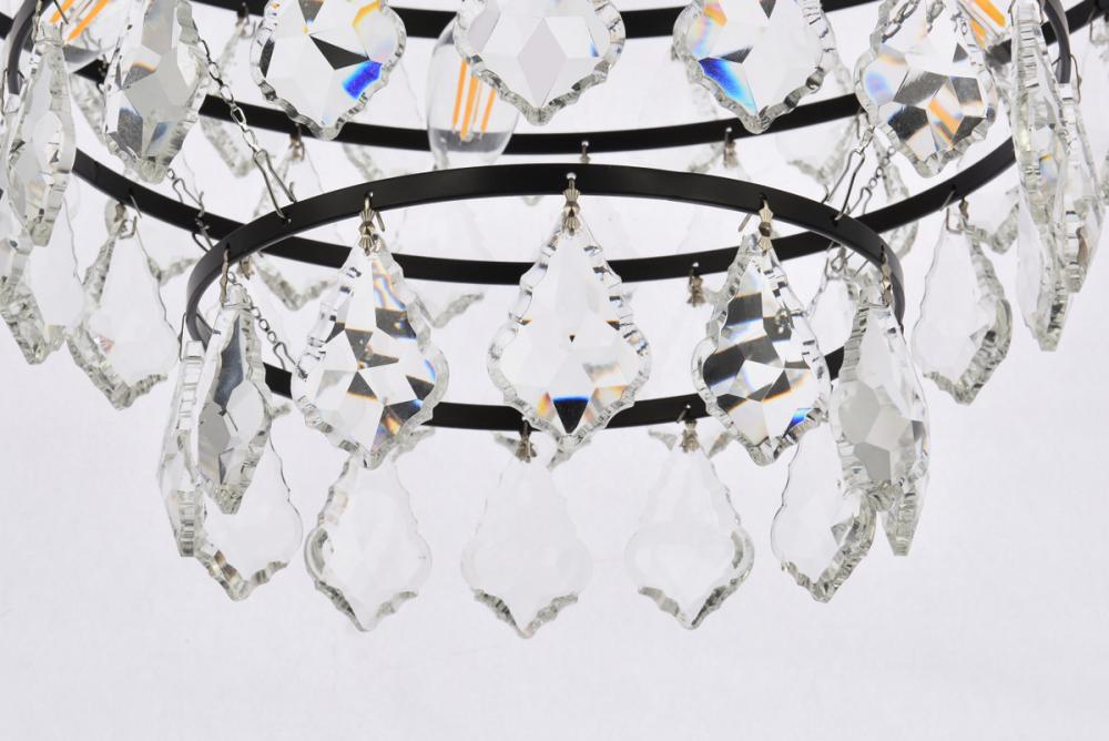Tiers of clear multi-faceted crystals reflect the soft glow of candelabra bulbs
