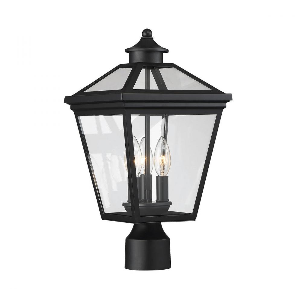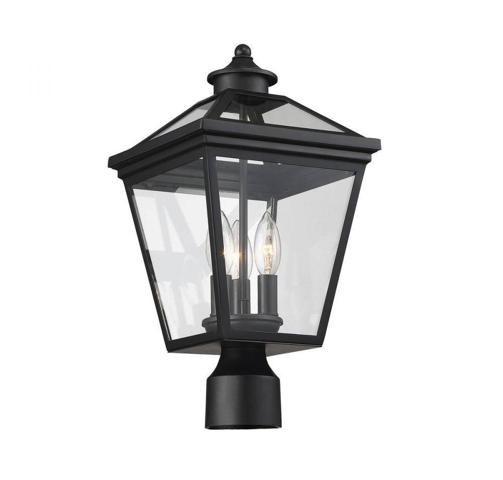 Brighten the exterior of your home and welcome your guests in style with the Savoy House Ellijay 3-light outdoor post lantern. The design mimics a vintage gas lantern with a classic tapered box shape and decorative top finial. The black finish looks terrific and blends well with other hardware and architectural materials. Panes of clear glass fill all four side panels and the roof panels, too. Three 60W candelabra size bulbs provide inviting and secure illumination. This lantern measures 9" wide and 17.5" high. You’ll enjoy its timeless style and enhance the beauty of your property, whether near your walkway, patio, pergola or other outdoor living areas in your yard and garden.
