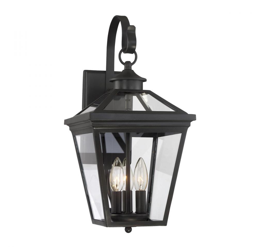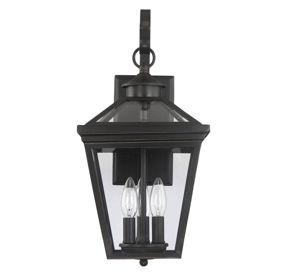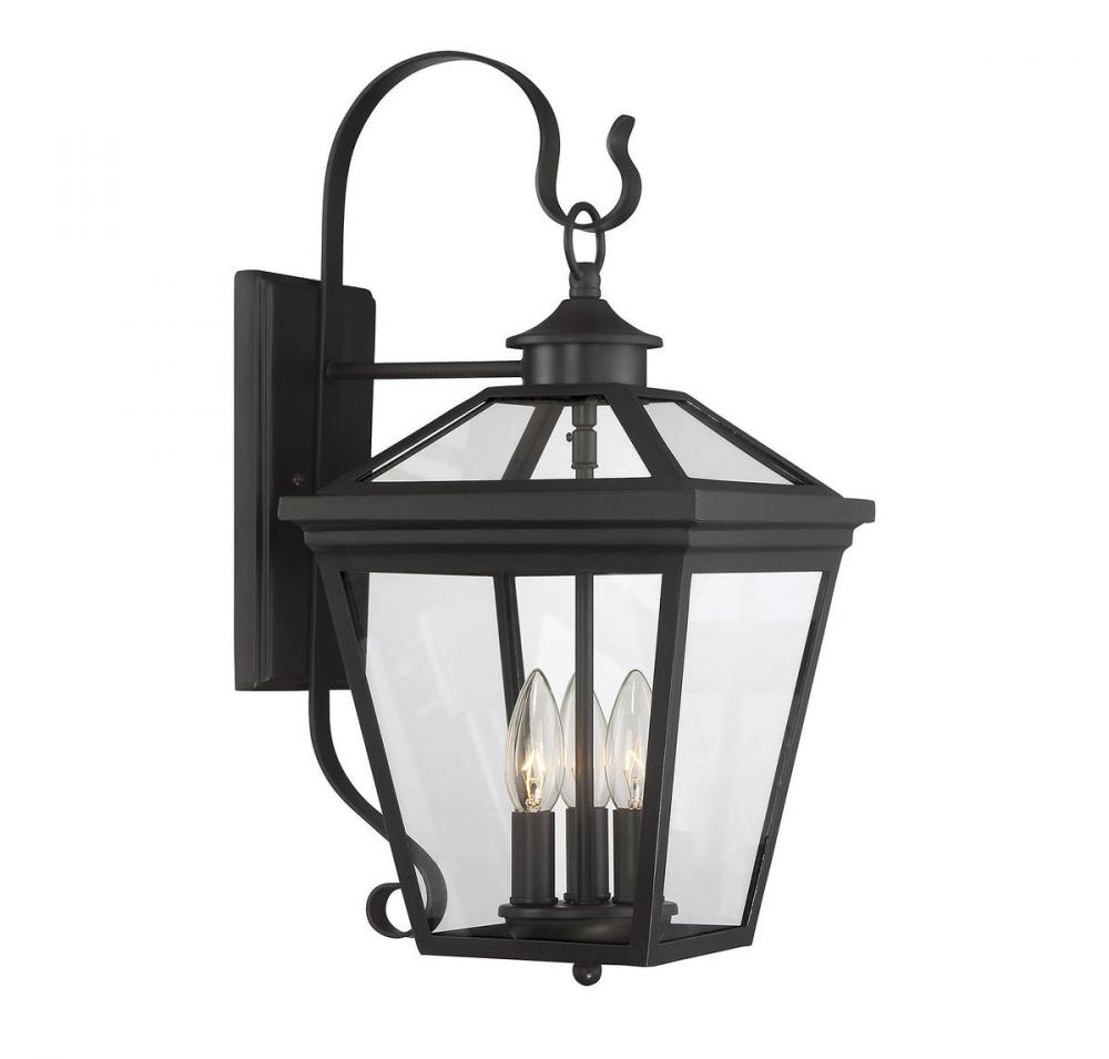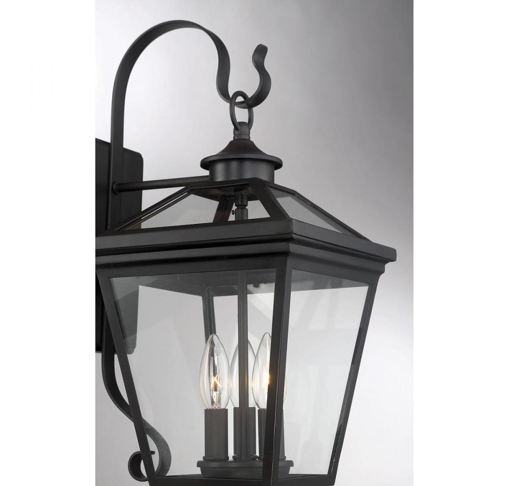 Brighten the exterior of your home and welcome your guests in style with the Savoy House Ellijay 3-light outdoor wall lantern. The design mimics a vintage gas lantern with a classic tapered box shape and decorative top finial. A sumptuous English bronze finish adds traditional flair and blends well with other hardware and architectural materials. Panes of clear glass fill all four side panels and the roof panels, too. Three 40W candelabra size bulbs provide inviting and secure illumination. This lantern measures 9" wide, 19" high and extends 11.25" from the wall.