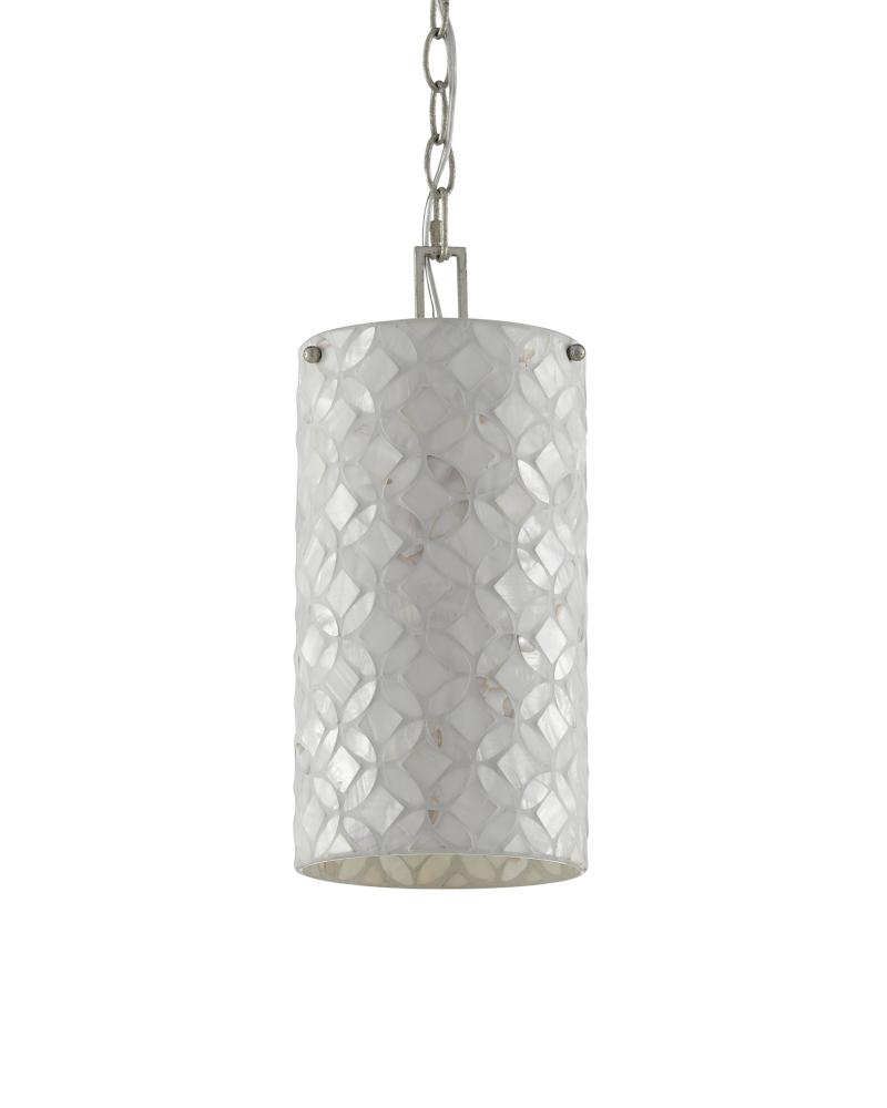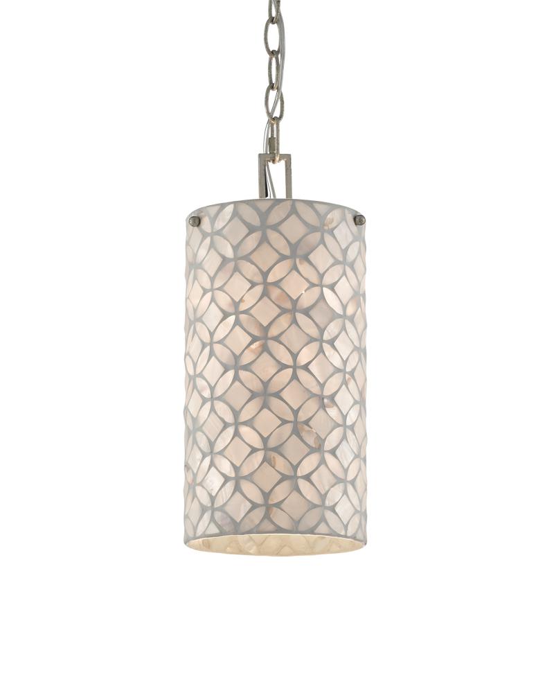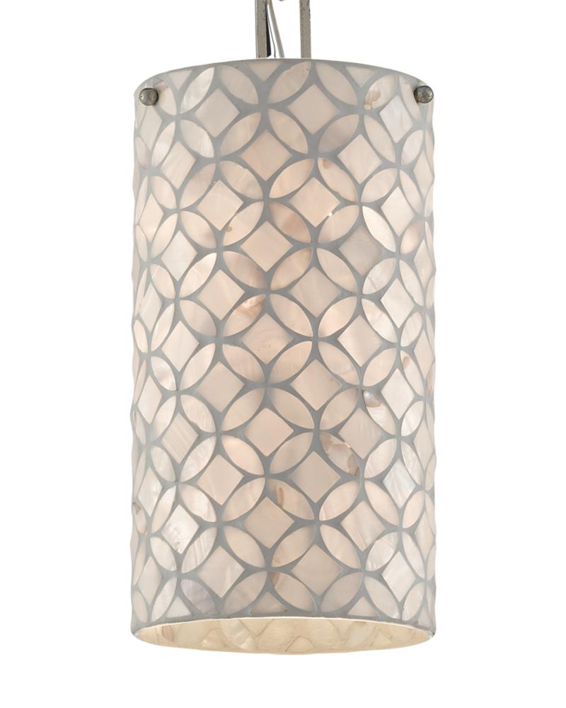 The four-point star and circle pattern on the shade of the Ellison Pendant takes on added luminosity given it is made with mother of pearl. The antique silver leaf finish on the chain and the rectangular chain loop bring geometric interest to this silver pendant. Adjustable from 21.5" to 88.5" with use of included chain/rod kit/cable. If your space calls for a longer drop, additional chain/rods/cable is available for purchase.