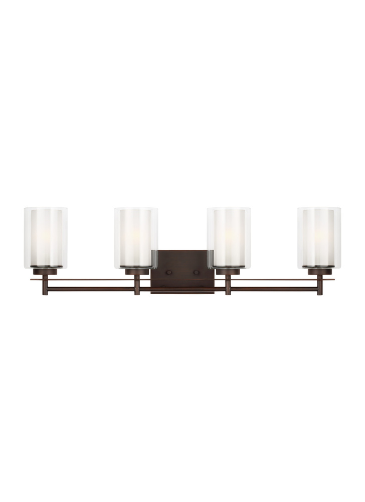 The Elmwood Park four light vanity fixture in bronze offers shadow-free lighting in your powder room, spa, or master bath room. Elmwood Park by has clear glass tube shades with an inner white glass element that softens the light and helps cast an even glow. A cylinder of etched glass is centered within a larger cylinder of clear glass which encircles each light bulb to create this stunning visual effect. The full assortment includes three-, five-and nine-light chandeliers, a four-light linear, one-light mini pendant, a three-light pendant, a two-light semi flush which is convertible into a pendant, and one-, two-, three- and four-light bath fixtures. All fixtures offered in either a Brushed Nickel or Brushed Oil Rubbed Bronze. Incandescent and ENERGY STAR-qualified LED lamping are available; all fixtures are California Title 24 compliant.