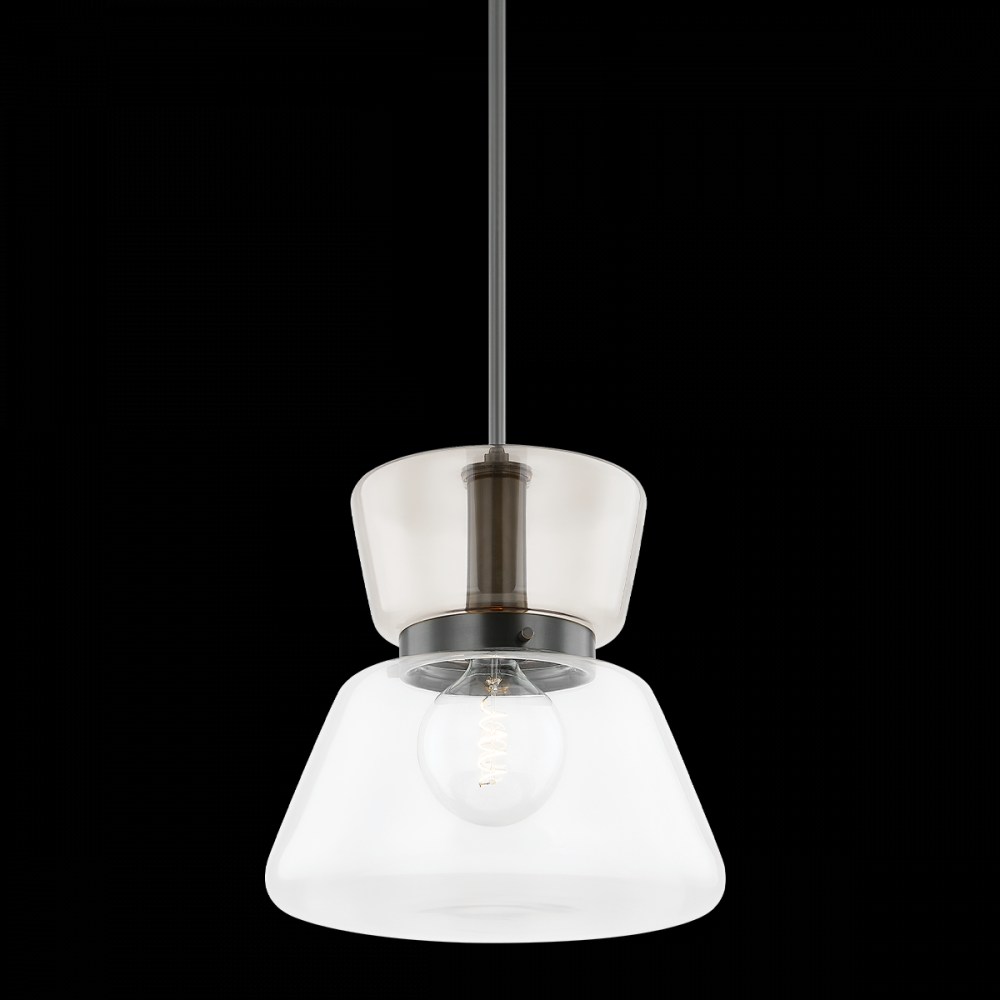 Contrasting glass shades and a sleek metal frame define the asymmetric hourglass silhouette of Elodie. This totemic pendant owes its graphic quality to the juxtaposition of clear and light bronze-plated glass forms. The choice between Aged Brass or True Bronze finishes allows you to lean into a more classic or industrial aesthetic. Whether suspended above countertops, in a living room, or at a bedside, Elodie sets the mood in style.