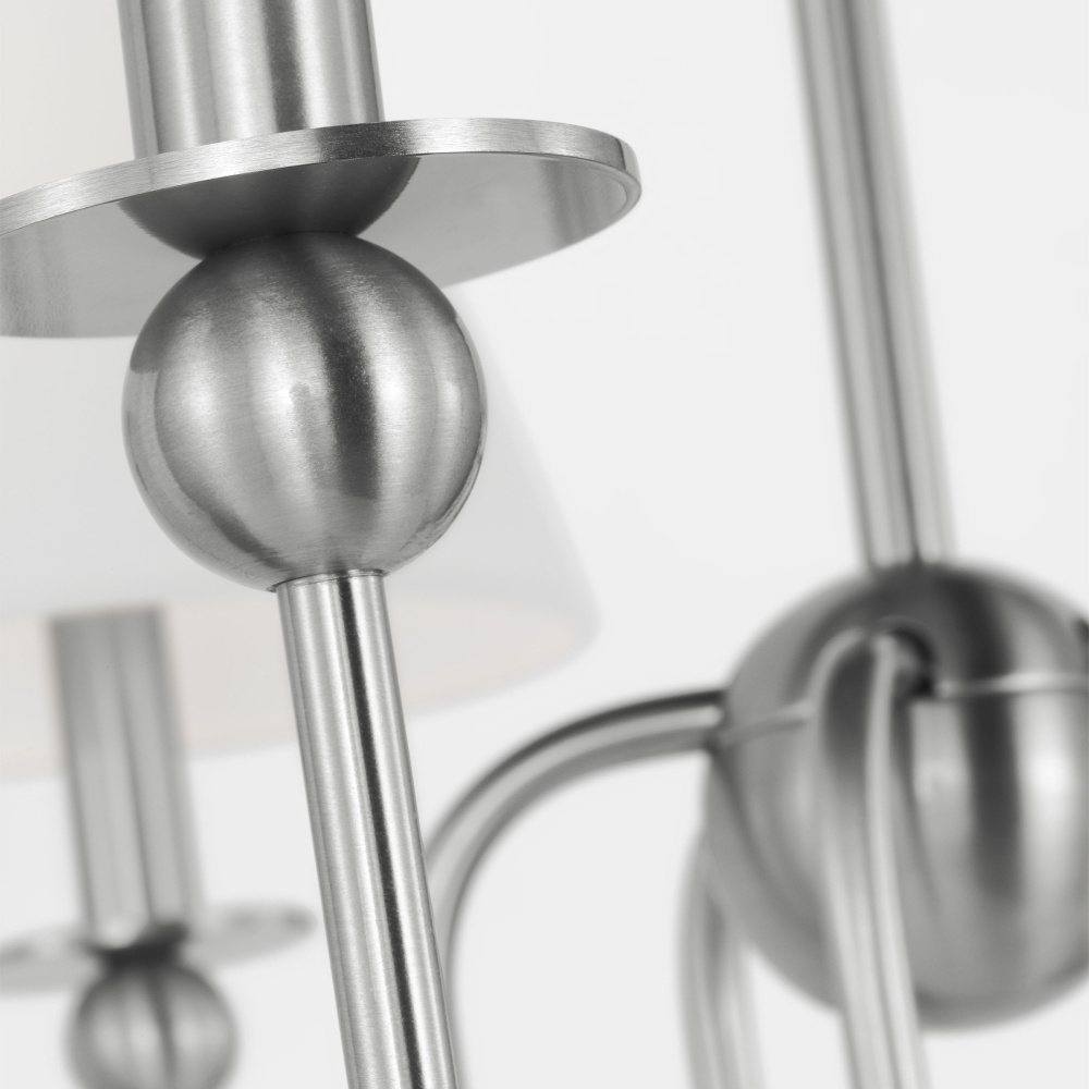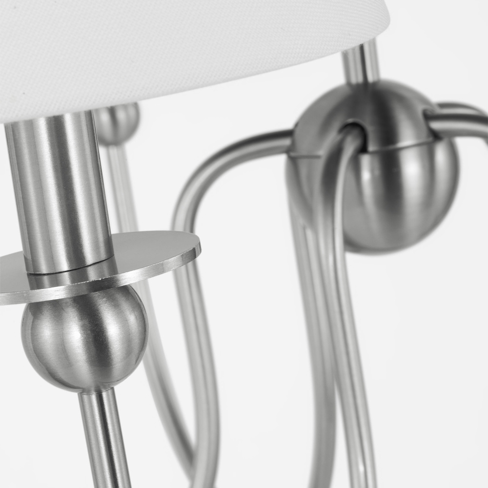 Crafted with Steel in a Brushed Nickel finish with white linen fabric shades
