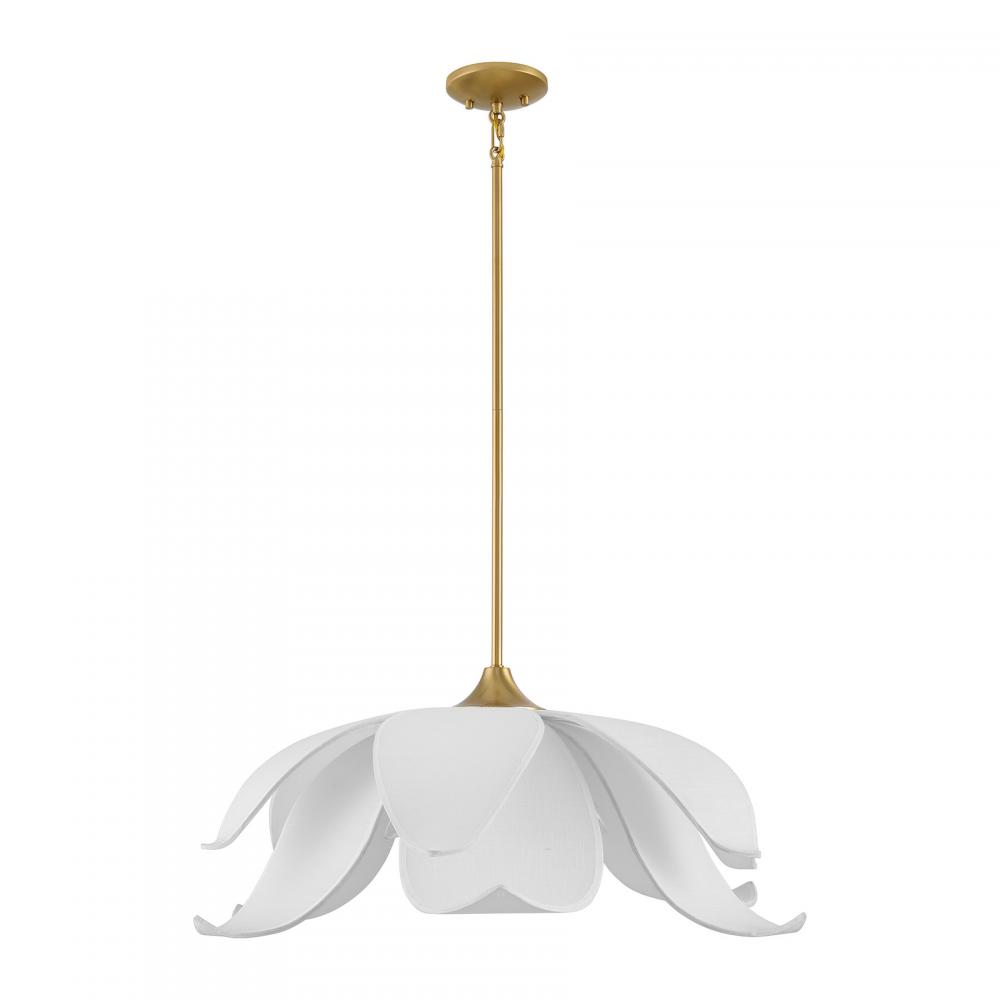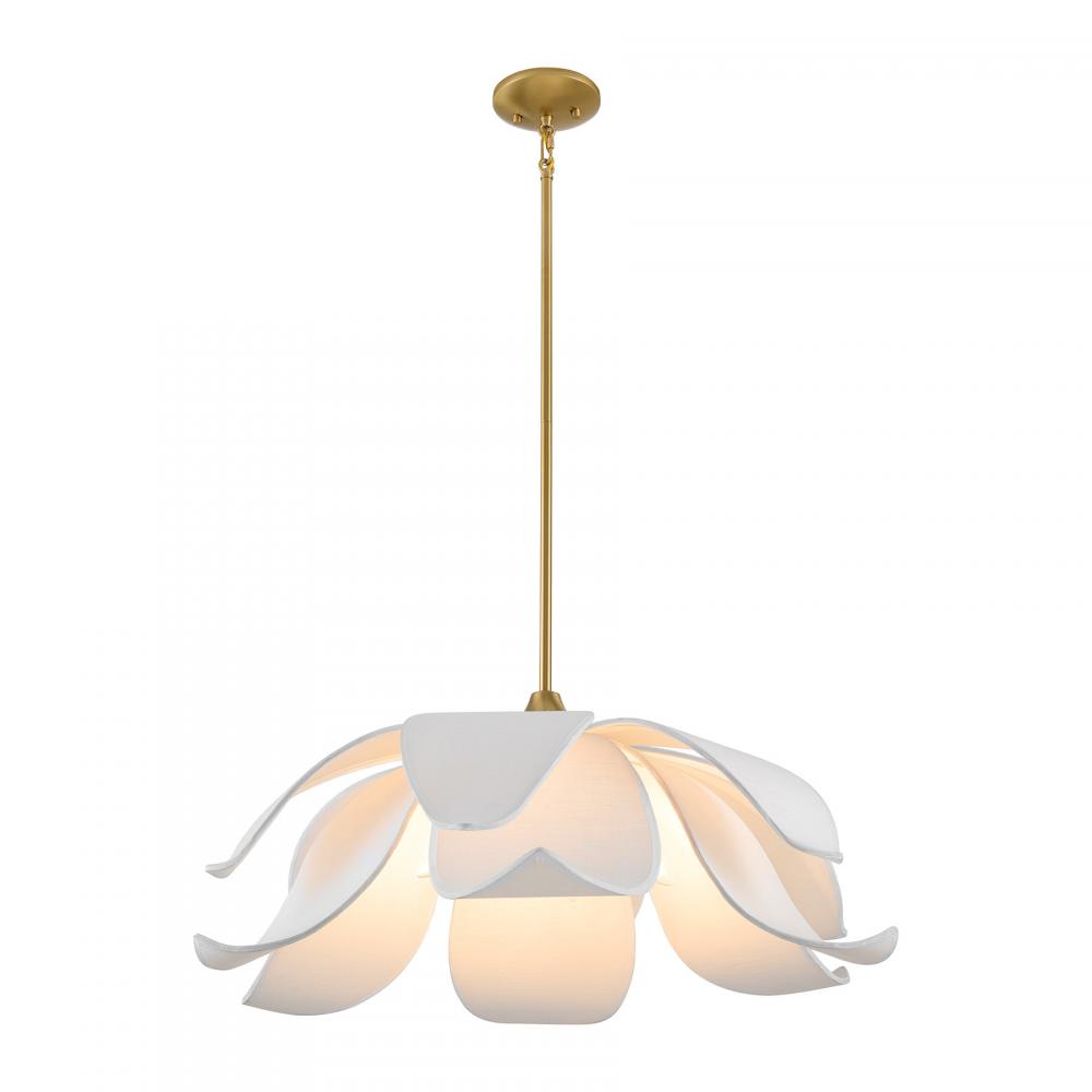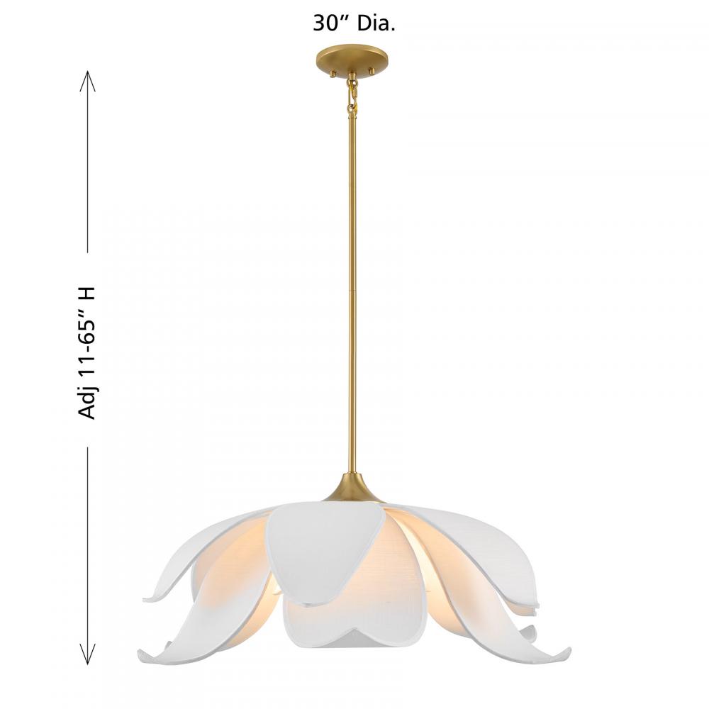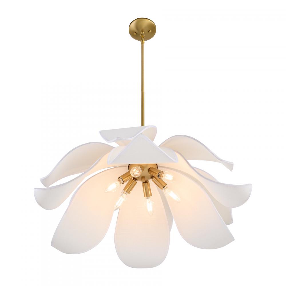Let your style bloom with the elegant Savoy House Elsie 6-light pendant, designed by award-winning interior designer and TV host Breegan Jane. Its floral design features curling white fabric petals and a bright Warm Brass finish, reflecting Breegan's mission of blending outstanding functionality with delightful silhouettes and making it a lovely choice for adding beauty to any room. Elsie is 11" in height and 30" in width. Uses six candelabra size bulbs of up to 60 watts per bulb. Bulbs not included.