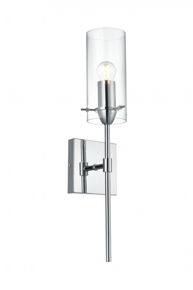 Elevate the ambiance of your space with this stunning wall sconce. Featuring a sleek chrome finish, this wall sconce blends modern style with classic elegance. The elongated metal arm supports a cylindrical clear glass shade that beautifully showcases the bulb, adding a striking architectural detail. Its minimalist square backplate and torch-like design create a sophisticated silhouette, perfect for any room—from a hallway or living room to a bathroom or bedroom. The chrome finish adds a reflective quality that enhances its modern appeal while complementing other metallic accents in your decor. This sconce requires one E26 socket bulb (not included) and is compatible with dimmable features, allowing you to set the perfect lighting mood.