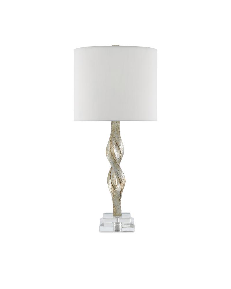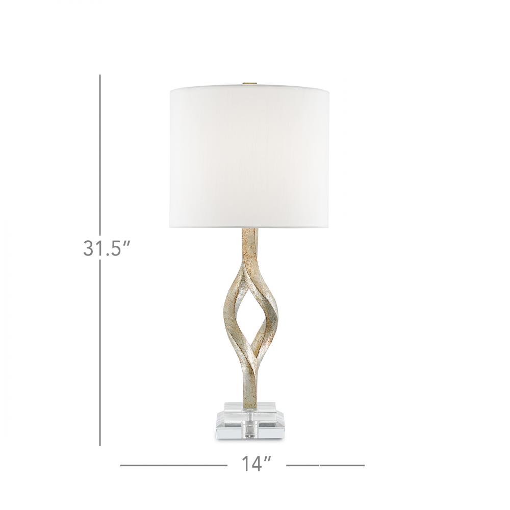 The Elyx Table Lamp may read like a brawny twist of heavy metal but the real twist to this design is that it is made of composite so it is a light and airy version of the inimitable metal beam. This is one of our design team�s original hand-sculpted pieces, which has been treated to a silver leaf finish for extra sheen. Enhancing the lightness of the design is an acrylic base and an off-white shantung shade. The lamp will enliven any corner of a room with its slight-of-hand.