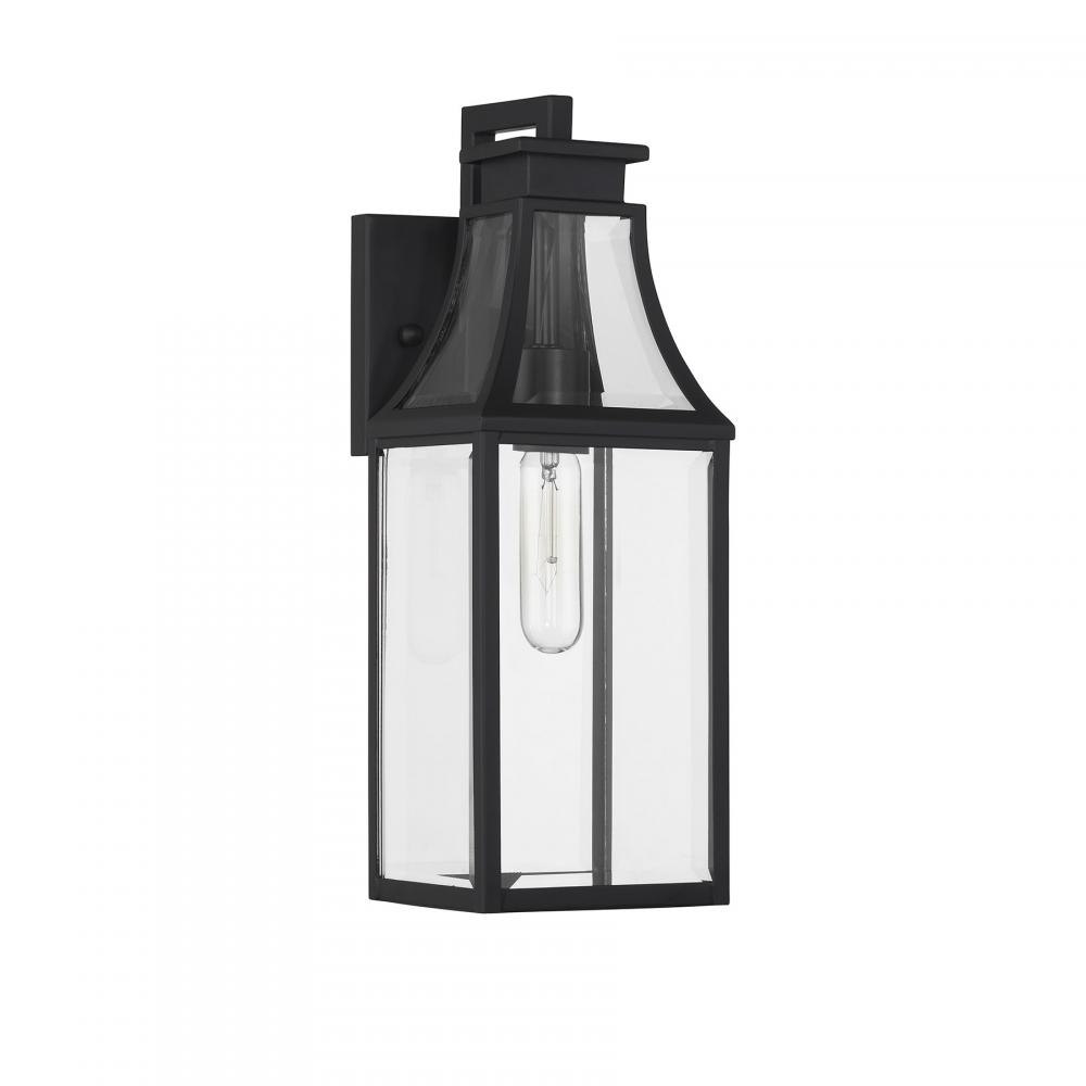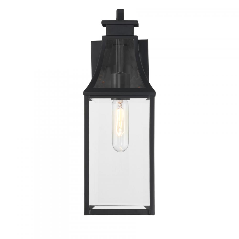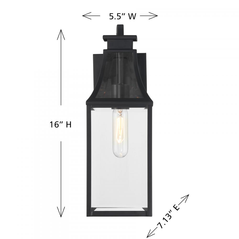 The Savoy House Emery 1-light outdoor wall lantern features a timeless style inspired by charming English cottage homes. Its curving hood and panels are all fitted with clear glass panes that give off a bright glow to light the way. The Matte Black finish is endlessly versatile. Emery is 16" in height, 5.5" in width and extends 7.13" from the wall. Uses one standard size bulb of up to 60 watts. Bulb not included. Emery is wet area rated for use in covered or uncovered outdoor areas.
