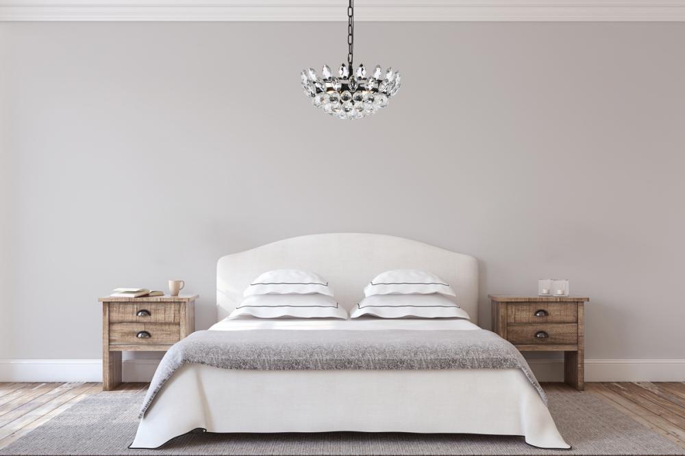Tiers of clear multi-faceted crystals reflect the soft glow of candelabra bulbs