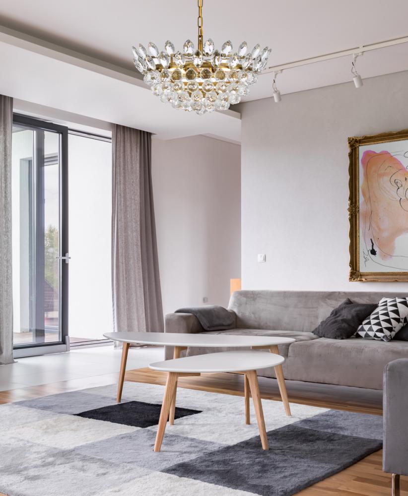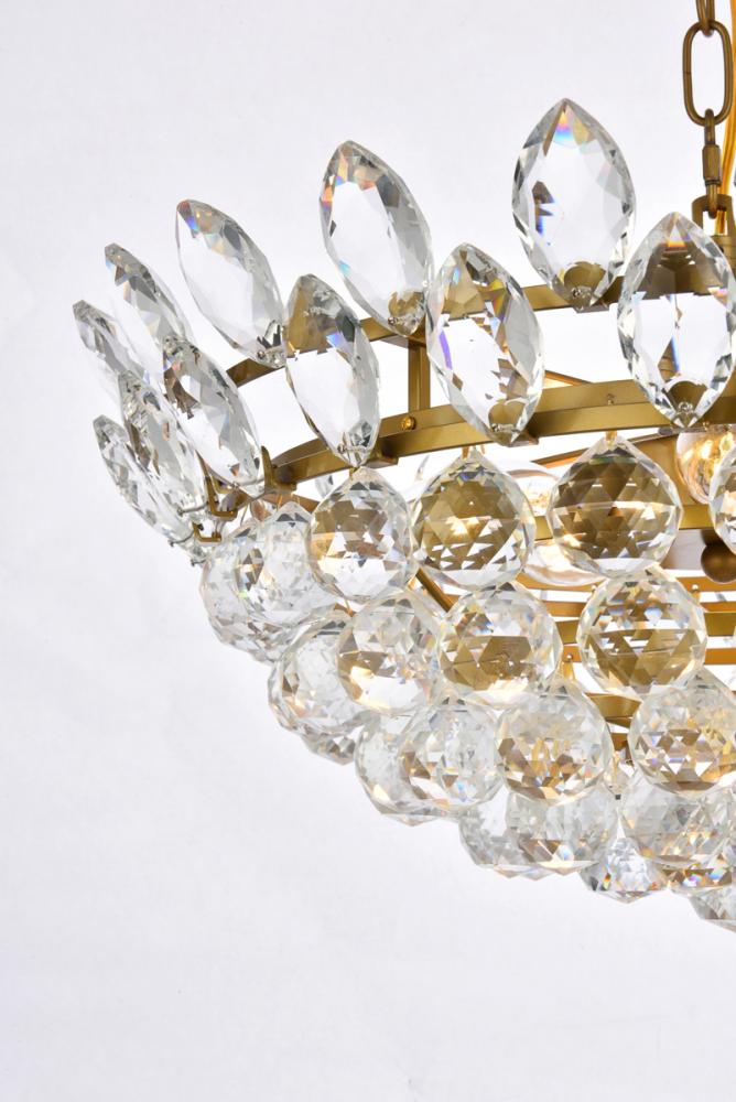 Tiers of clear multi-faceted crystals reflect the soft glow of candelabra bulbs