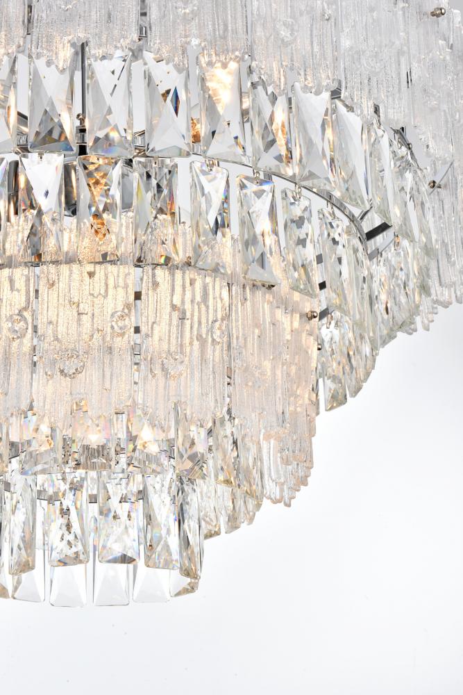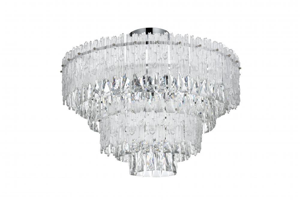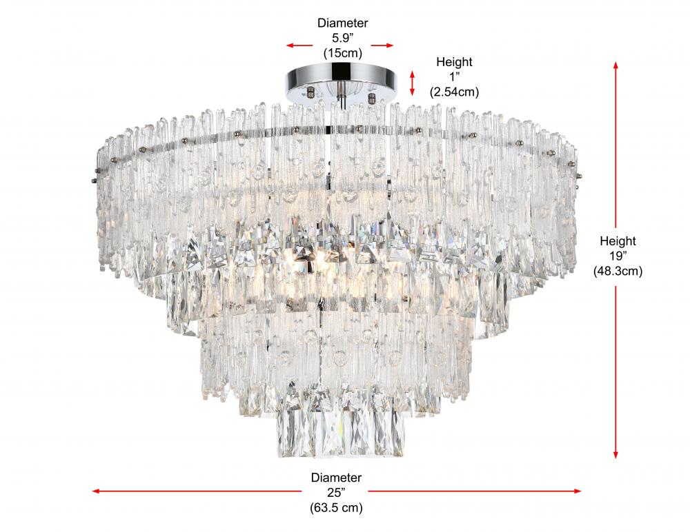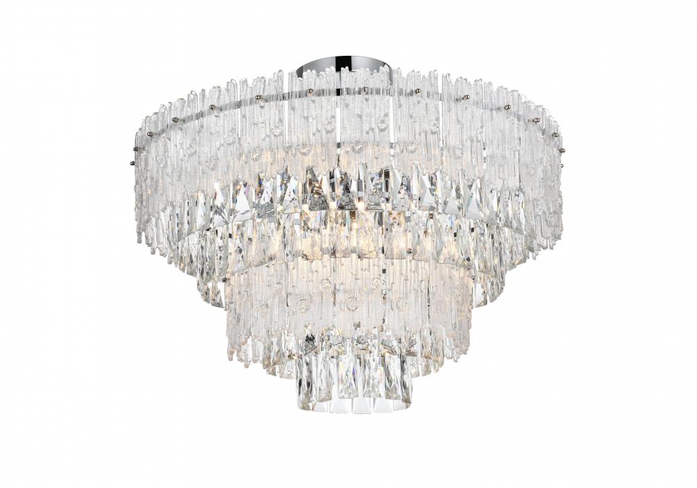 Transform your home with the opulent charm of this indoor lighting, meticulously designed to make a statement in any space. The light fixture showcases an intricate array of precision-cut clear crystals, each expertly faceted to maximize light refraction and create a dazzling display of brilliance. These crystals are complemented by textured glass accents that add depth and visual interest, casting a soft, shimmering glow across the room. Available in your choice of chrome or satin gold finishes, it is the epitome of luxury and modern elegance. As part of a coordinated collection, it also includes matching chandeliers, wall sconces and flush mounts, allowing you to create a harmonious lighting scheme throughout your home.