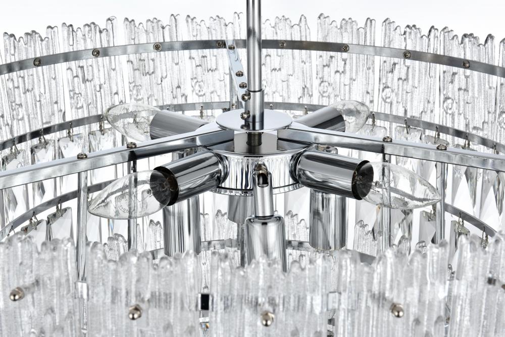 The combination of clear crystals and textured glass creates a sophisticated light play, perfect for setting an elegant mood.