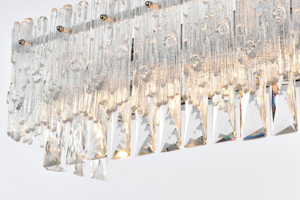The combination of clear crystals and textured glass creates a sophisticated light play, perfect for setting an elegant mood.