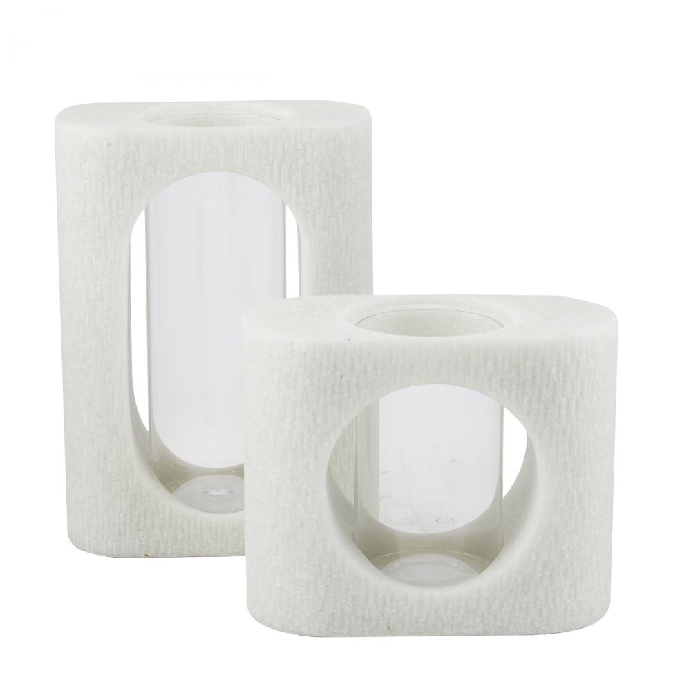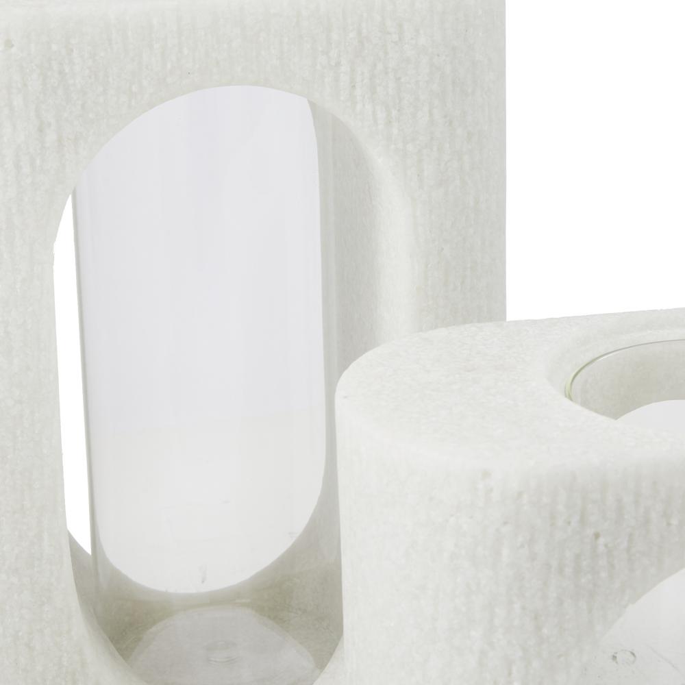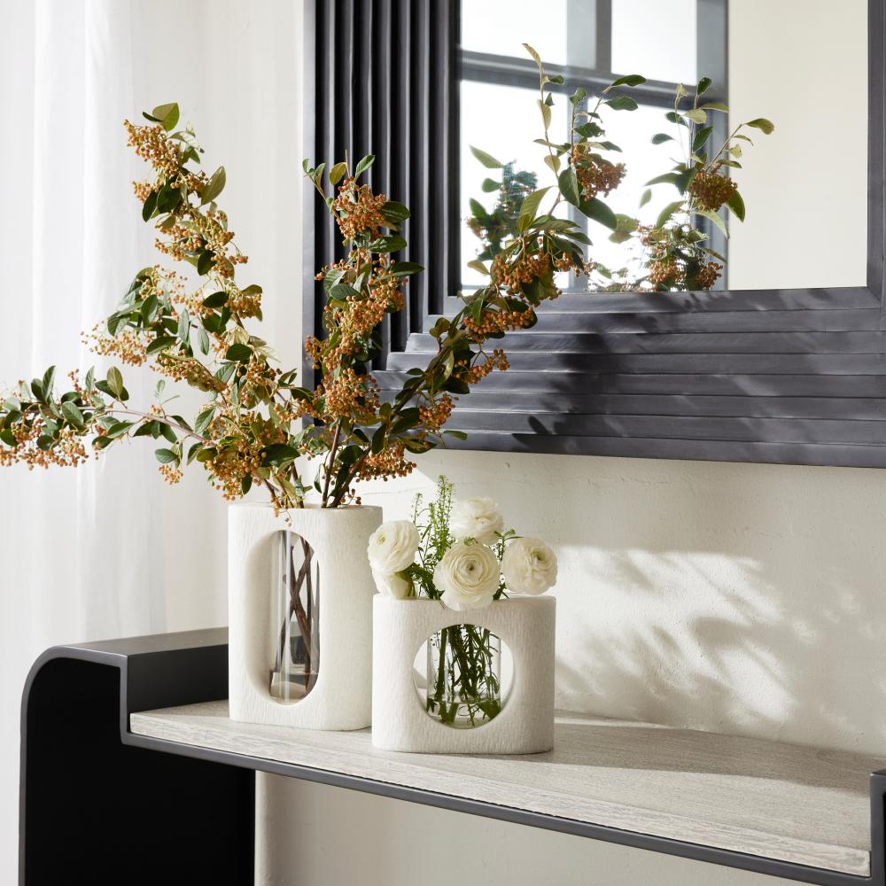We finished our contemporary vases with elemental cutouts. Designed of ivory ricestone composite with clear glass centers to display the stems and blooms of your favorite bouquet. Finish will vary.
