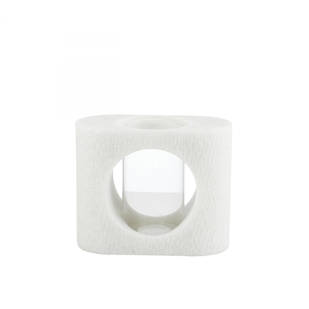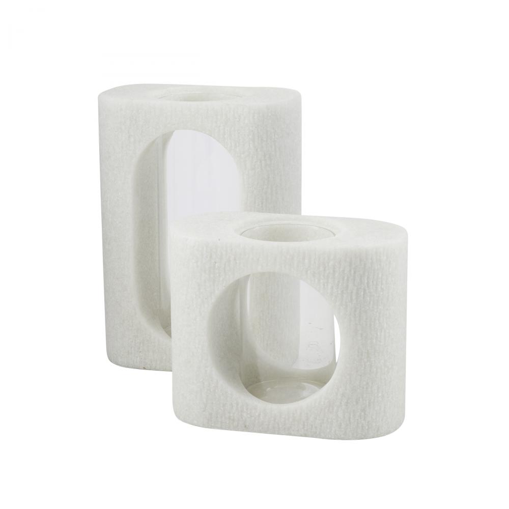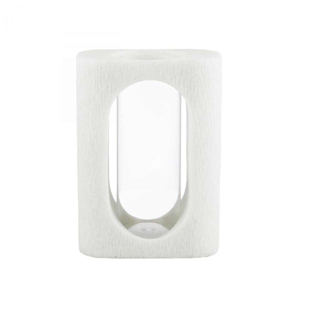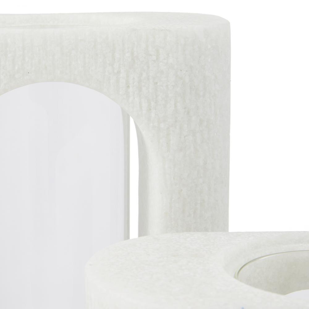We finished our contemporary vases with elemental cutouts. Designed of ivory ricestone composite with clear glass centers to display the stems and blooms of your favorite bouquet. Finish will vary.
