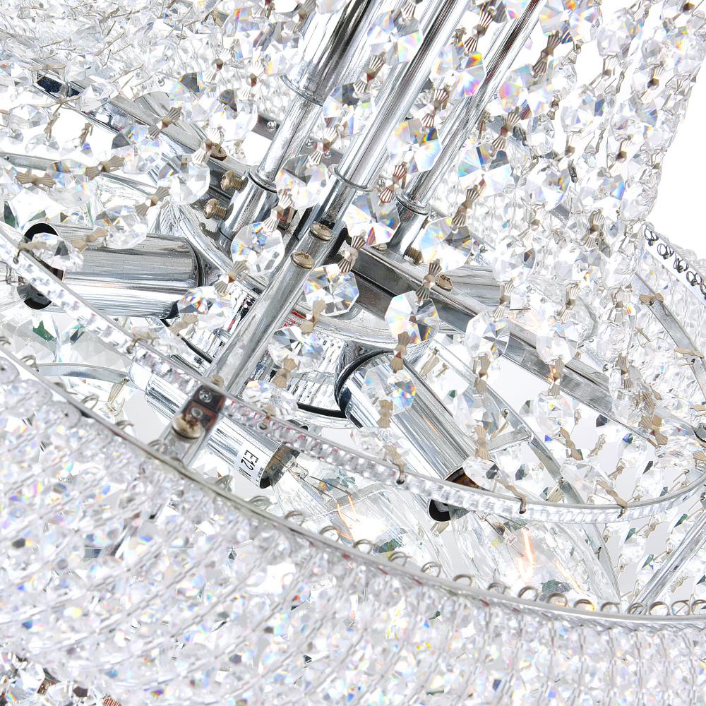 Add a touch of glamour to your living space through the Empire 14 Light Chandelier in Chrome. This glam lighting features candelabra bulbs held by a metal frame that's wrapped in glistening clear crystals. This is the perfect choice to refresh the ambi