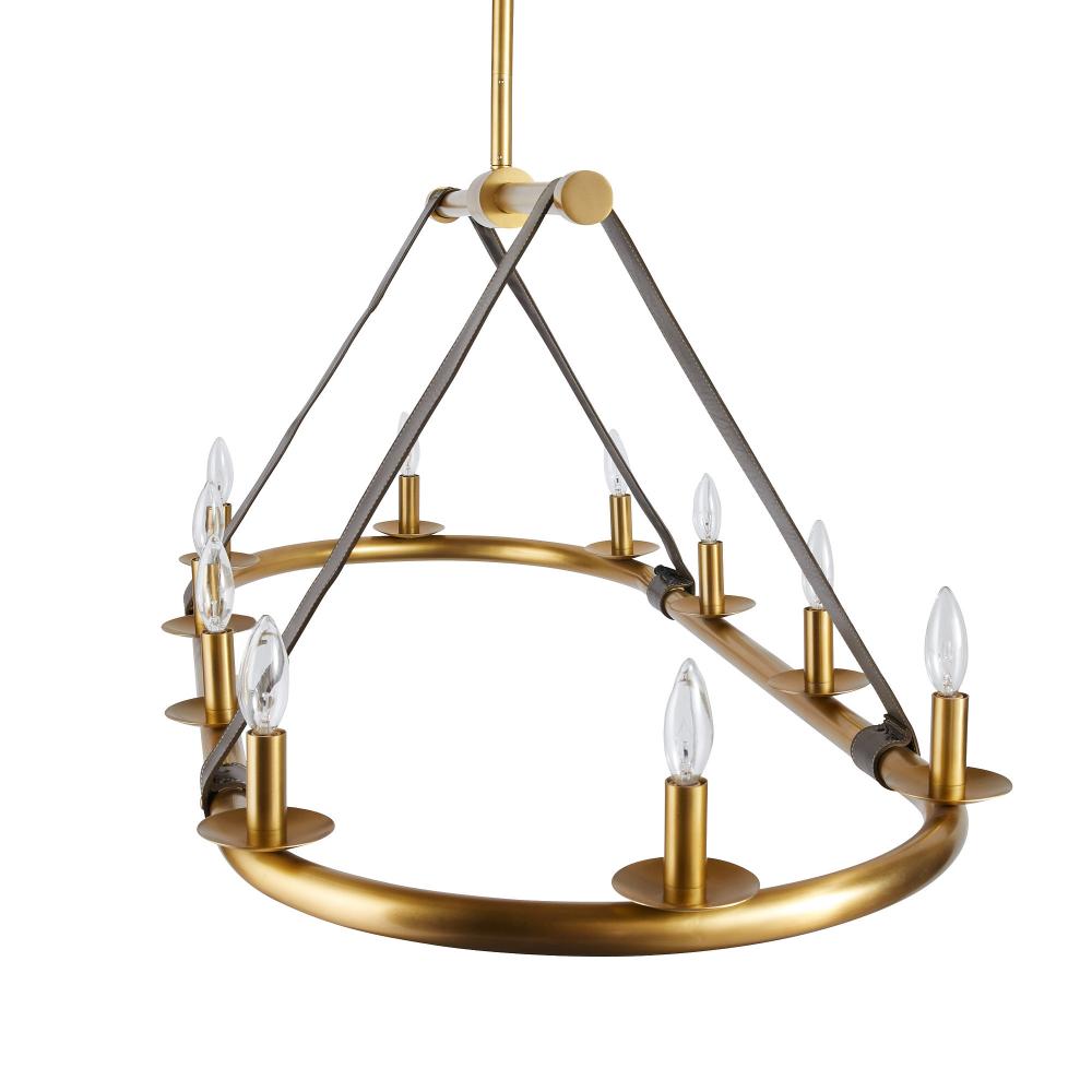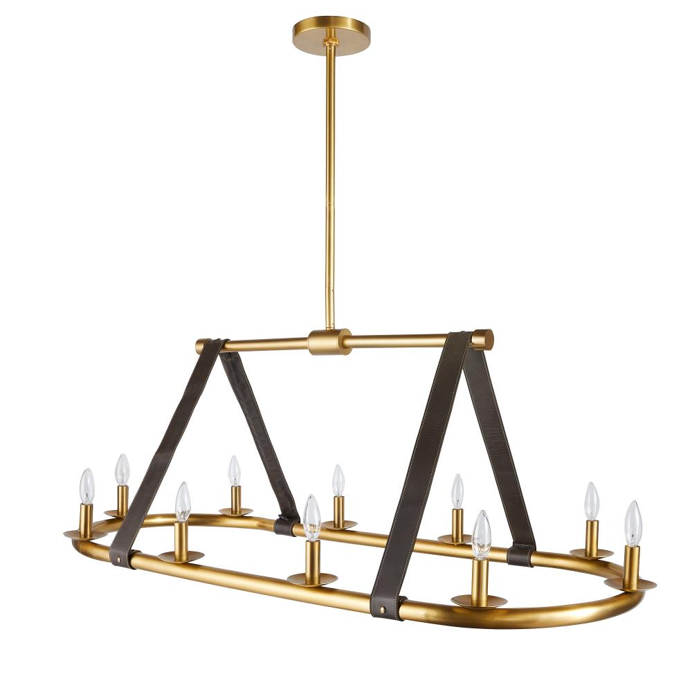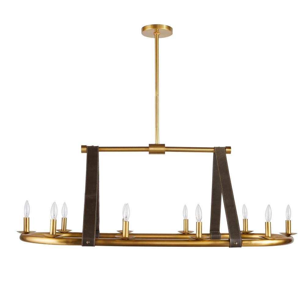 Sturdy leather straps in a moss hue give this linear fixture an equestrian modern vibe. Suspended from an iron frame plated in antique brass, they hold an oval frame punctuated by ten candle-like bulbs. Finish will vary.