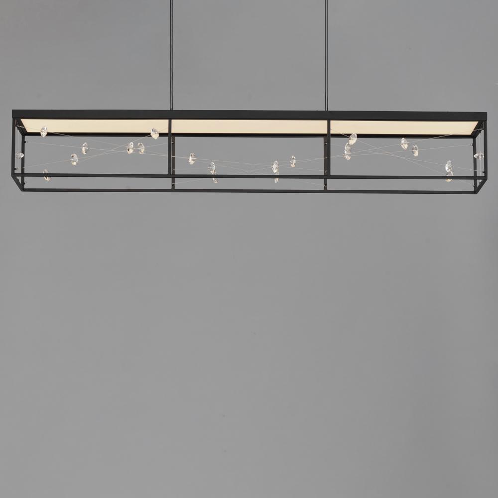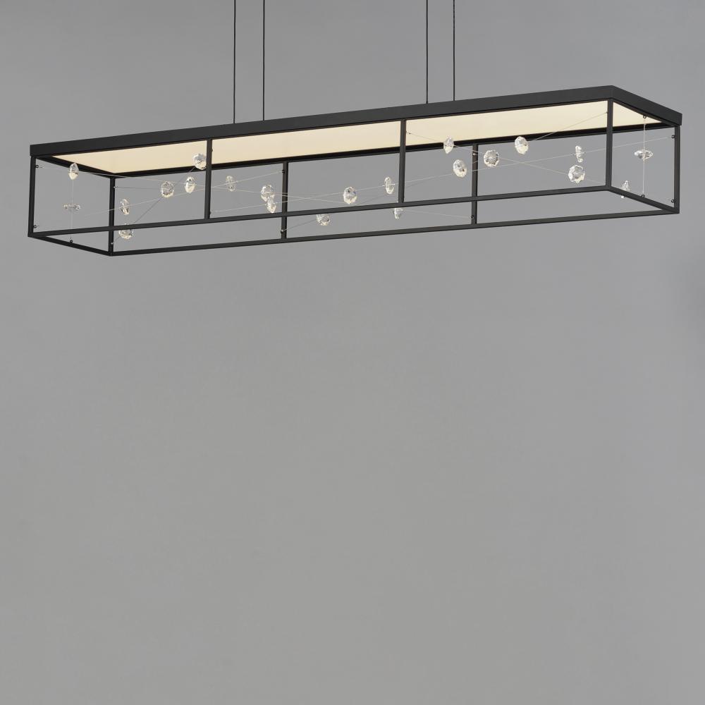A network of wire and crystal are suspended within a box frame illuminated from above. The light panel above highlights the iridescence of the crystal while providing ample illumination to the space below.