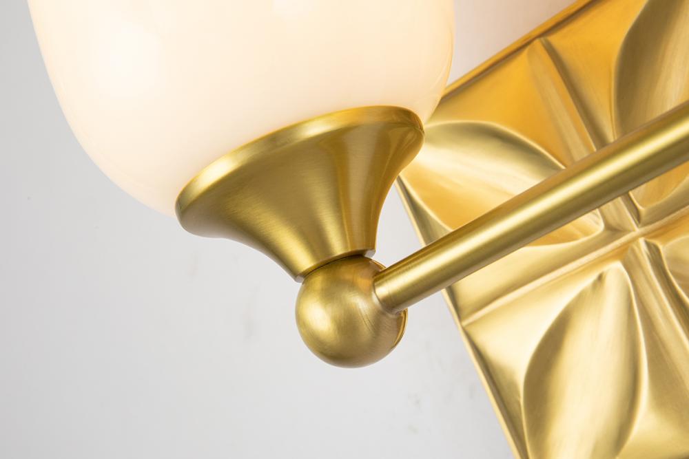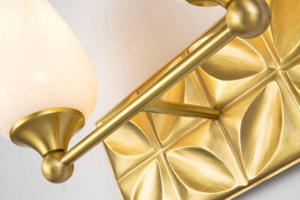 A 14" textured backplate vanity light in aged brass with two wine glass-shaped opal shades. Mounts up or down, blending modern design and elegance with detailed texture for bathrooms.
