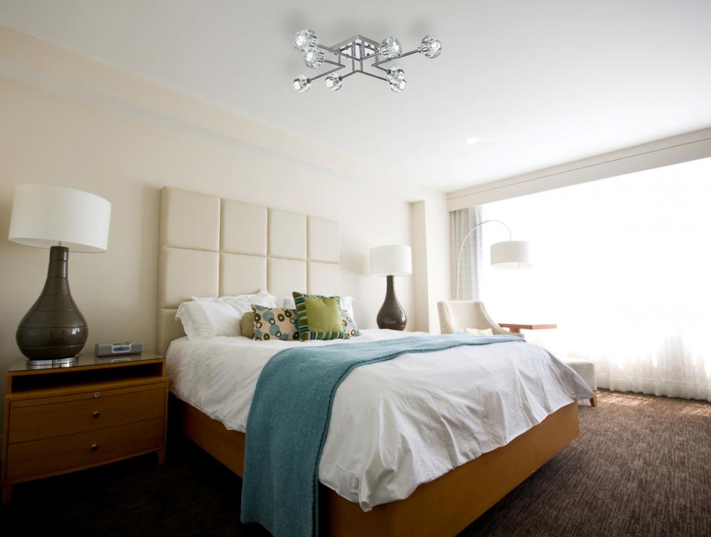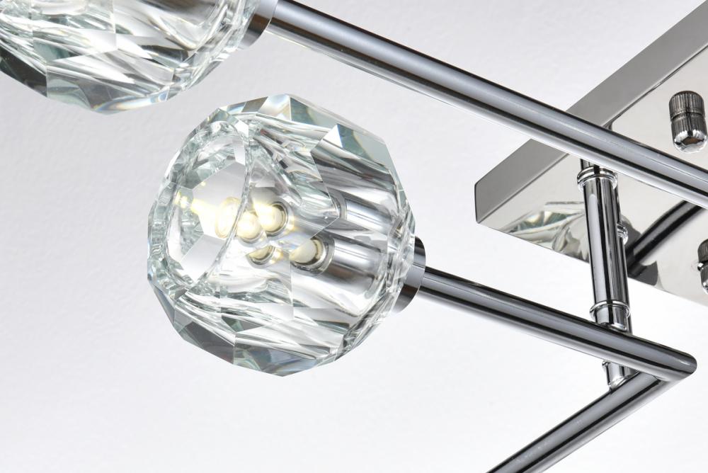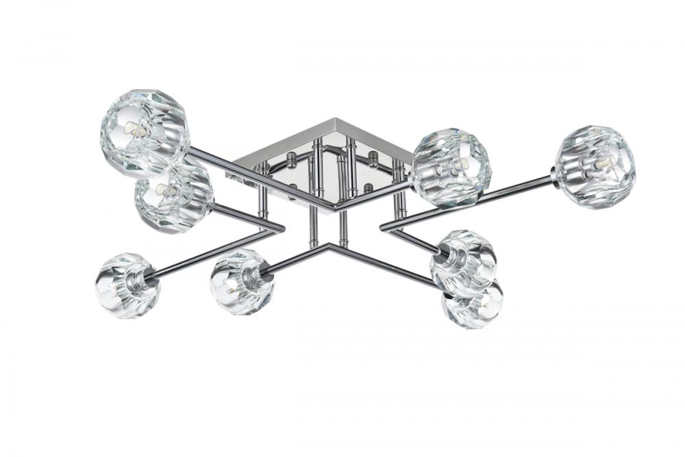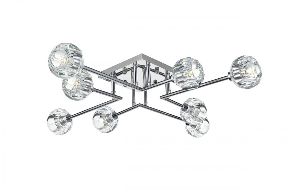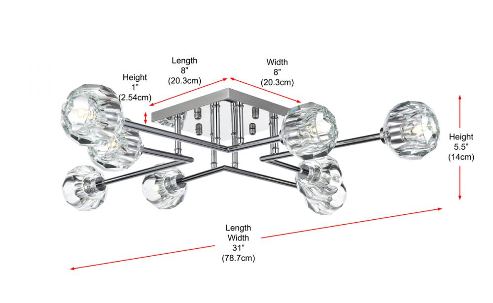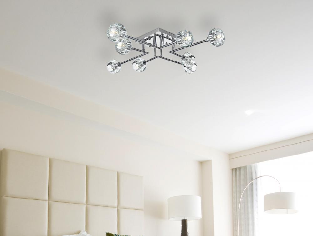 Introducing the Eren 31-inch flush mount— Introducing our 31-inch flush mount—a captivating addition that effortlessly enhances your space with a touch of contemporary sophistication, making a statement with its presence. Eight lights adorned with faceted crystal glass shades cast a luxurious and dazzling radiance, creating an atmosphere of timeless elegance. Crafted with durability in mind, the robust iron base complements the flush mount's contemporary design with a touch of industrial elegance. with a flush design, this fixture hugs the ceiling, delivering both space-saving practicality and elegant style. Redefine your space with the perfect blend of style, durability, and radiant illumination.