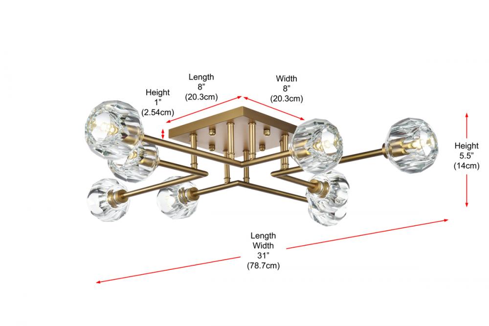 Introducing the Eren 31-inch flush mount— Introducing our 31-inch flush mount—a captivating addition that effortlessly enhances your space with a touch of contemporary sophistication, making a statement with its presence. Eight lights adorned with faceted crystal glass shades cast a luxurious and dazzling radiance, creating an atmosphere of timeless elegance. Crafted with durability in mind, the robust iron base complements the flush mount's contemporary design with a touch of industrial elegance. with a flush design, this fixture hugs the ceiling, delivering both space-saving practicality and elegant style. Redefine your space with the perfect blend of style, durability, and radiant illumination.