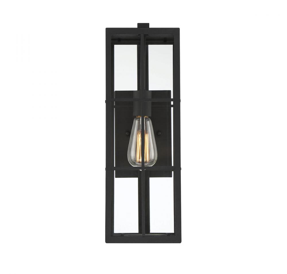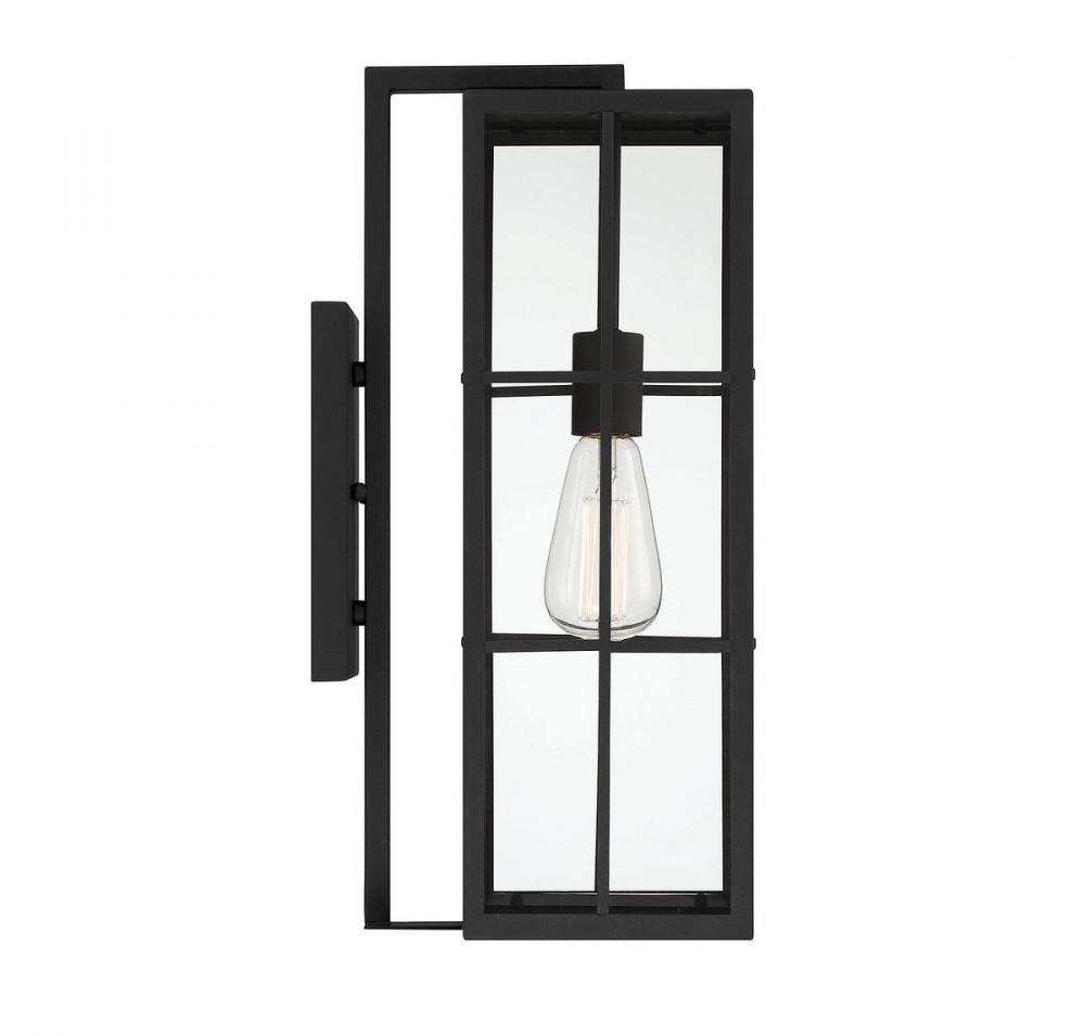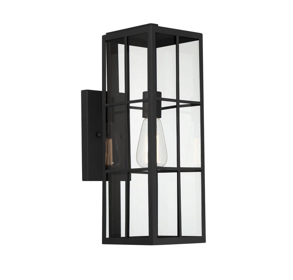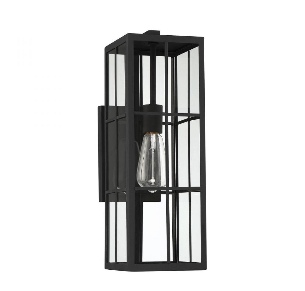 This Savoy House Ericson 1-light outdoor wall lantern features an intriguing look that is reminiscent of fashion-forward black paned windows. Whether Ericson is used solo or in groups, it is sure to create a beautiful first impression outside any home. Matte black finish with clear glass. Ericson is 18.5" in height, 6" in width and extends 9.25" from the wall. It uses one standard size bulb of up to 60 watts. Wet area rated.