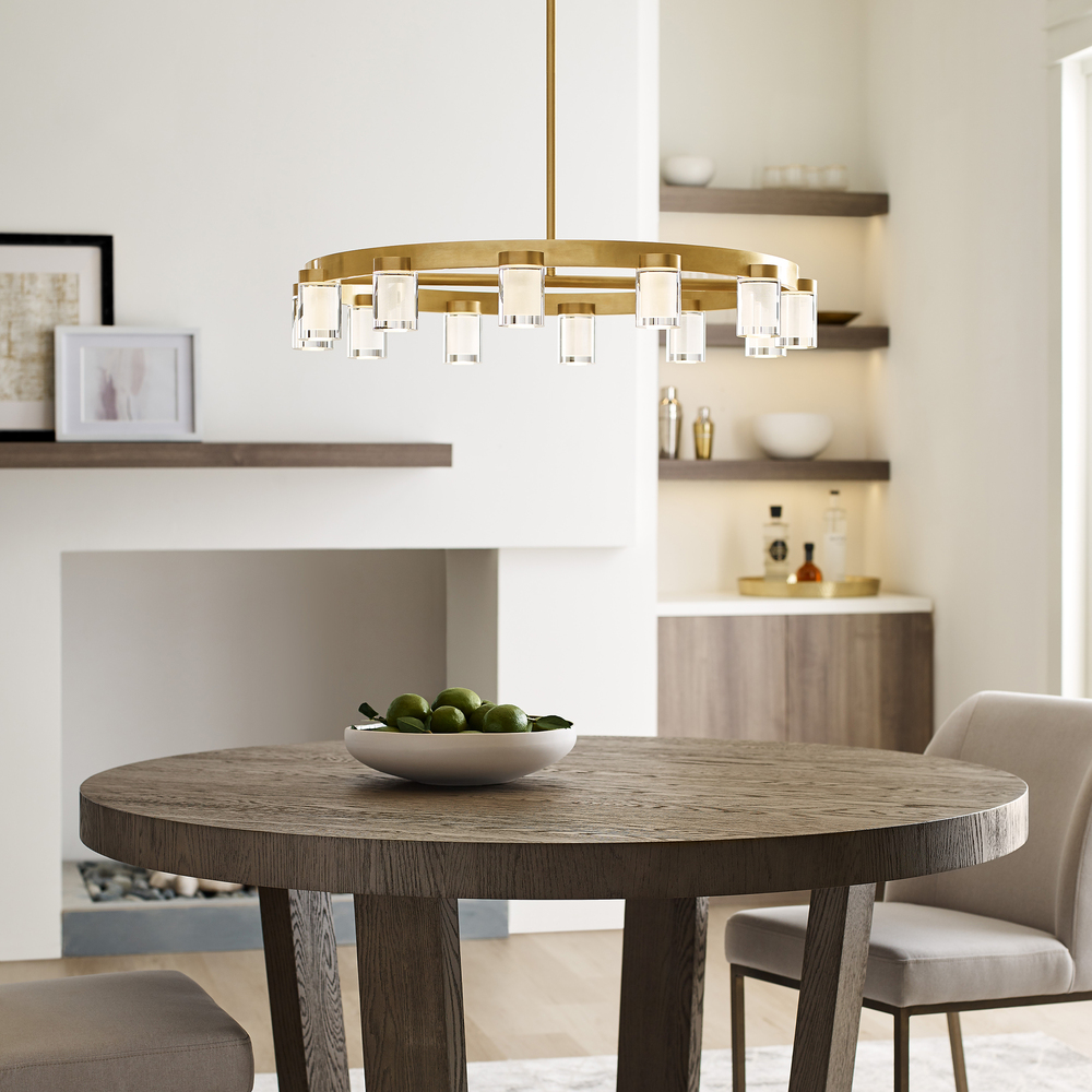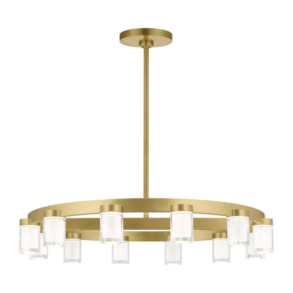 The Esfera Medium Chandelier by Kelly Wearstler for Visual Comfort Modern realizes the beauty of elemental materials and spatial symmetries. In an elevated exchange of visual textures and clarity of form, the transitional design of this piece is a modern portrait of the convergence of cylindrical multi-dimensional prisms as integral sources of light with simple, linear metal detailing in varied geometric gestures as the connecting base.