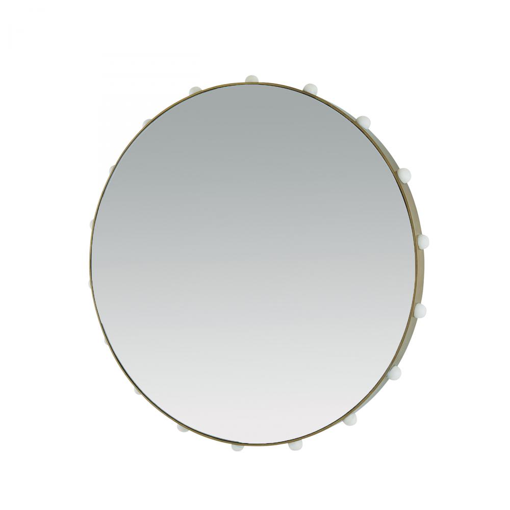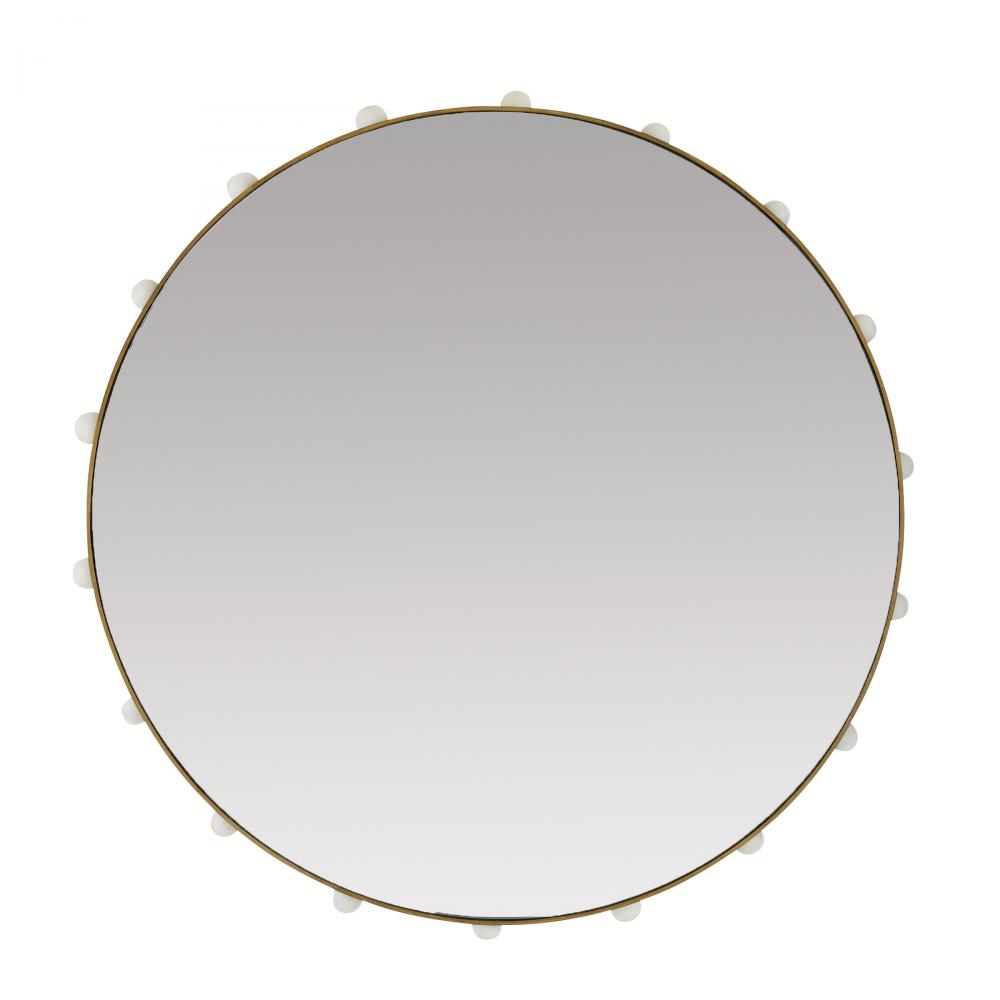 We elevated a classic round mirror by framing it in antique brass iron and adorned with white marble baubles. Reminiscent of a jewelry bezel on the band of a ring, the minimalist form is secured with a cleat at the back for hanging. Finish will vary.