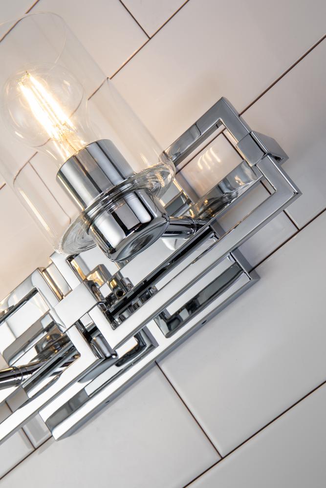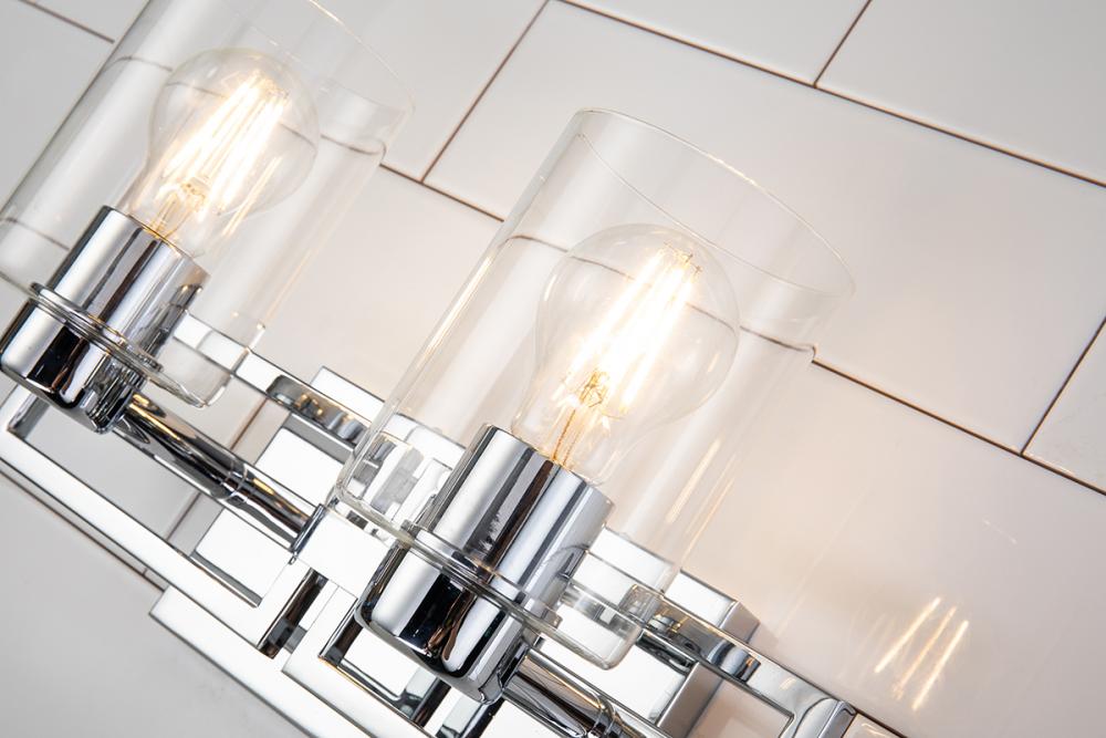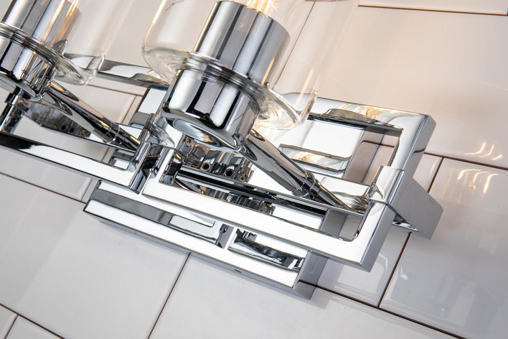 A 15" vanity light in polished chrome with rectangular lines and two curved cylinder shades. Mounts up or down, ideal for over-mirror use with mid-century elegance.