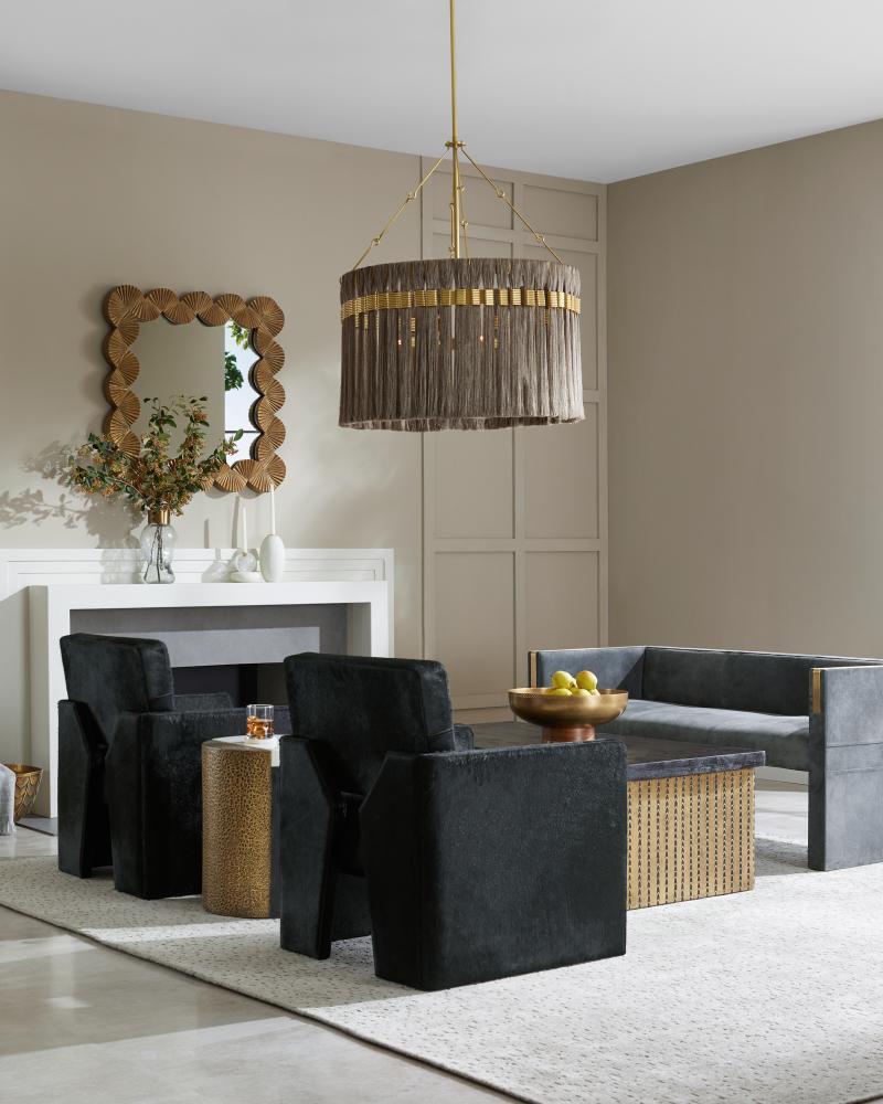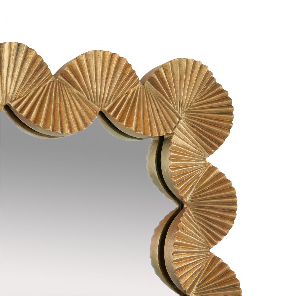 These aluminum rippling forms are finished in antique brass to add textural interest to this dramatic, dimensional accessory. The fan-like accents seemingly move in alternate directions to create unexpected contrast for the eye. Designed to be hung vertically, this mirror is finished with a cleat at the back for security.