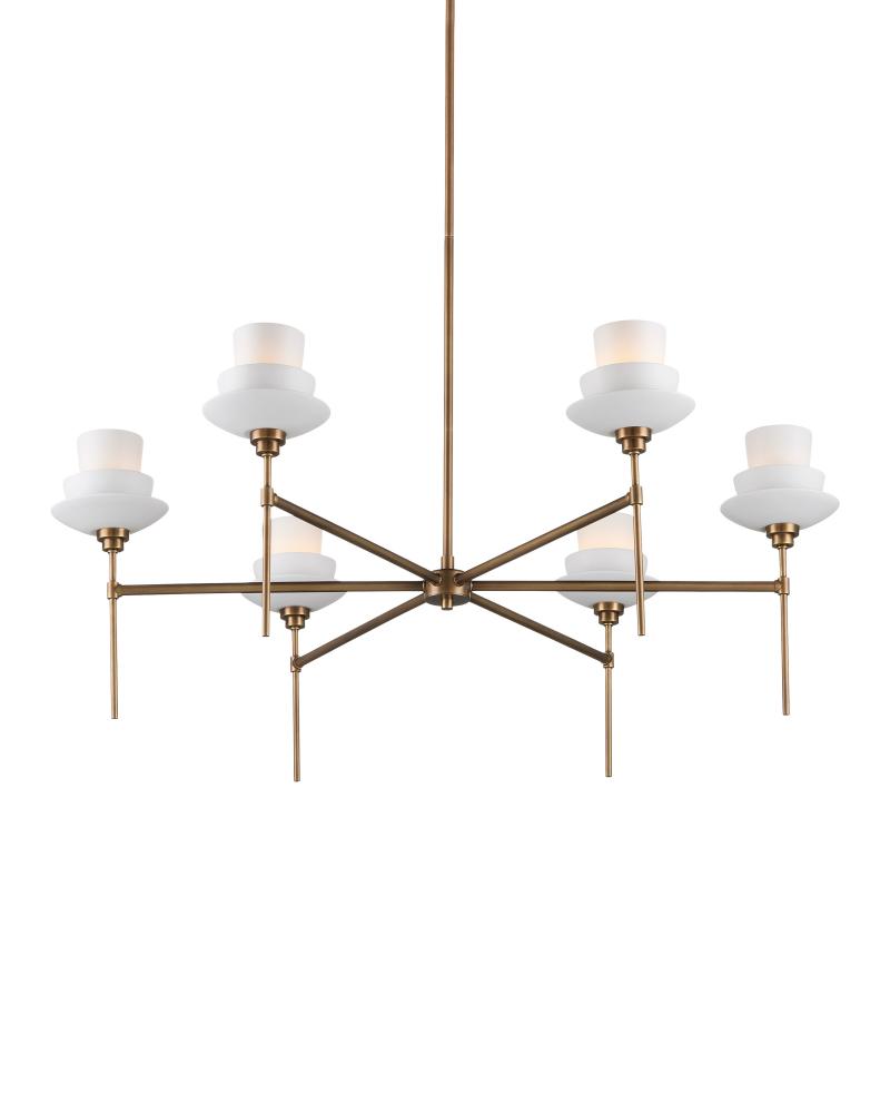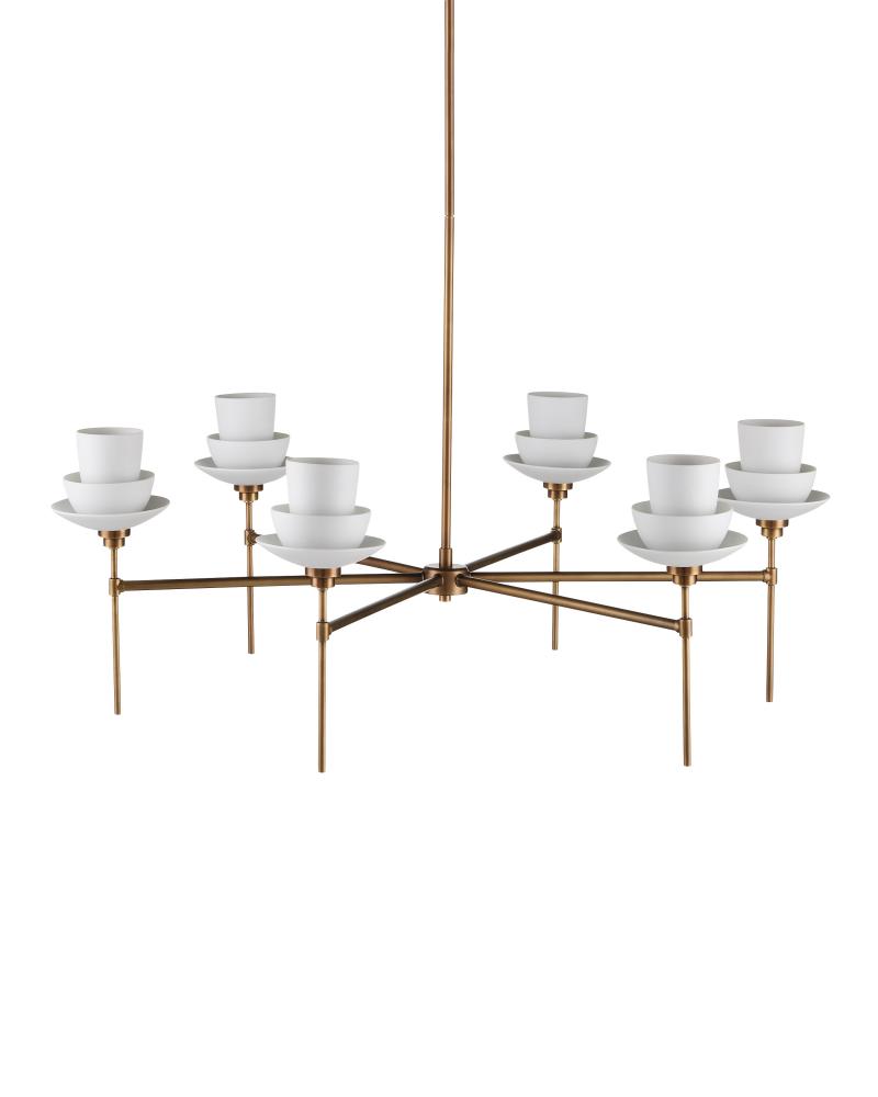 The Etiquette Chandelier is a mid-century-modern inspired chandelier made of metal in an antique brass finish. The telescoping stems hold semi-transparent bone China cups in graduating shapes that resemble tea cups. The luminous material softens the light that reflects from within. This gold chandelier was designed to be an uplight fixture with glowing shades. Adjustable from 24.5" to 66.5" with use of included chain/rod kit/cable. If your space calls for a longer drop, additional chain/rods/cable is available for purchase.