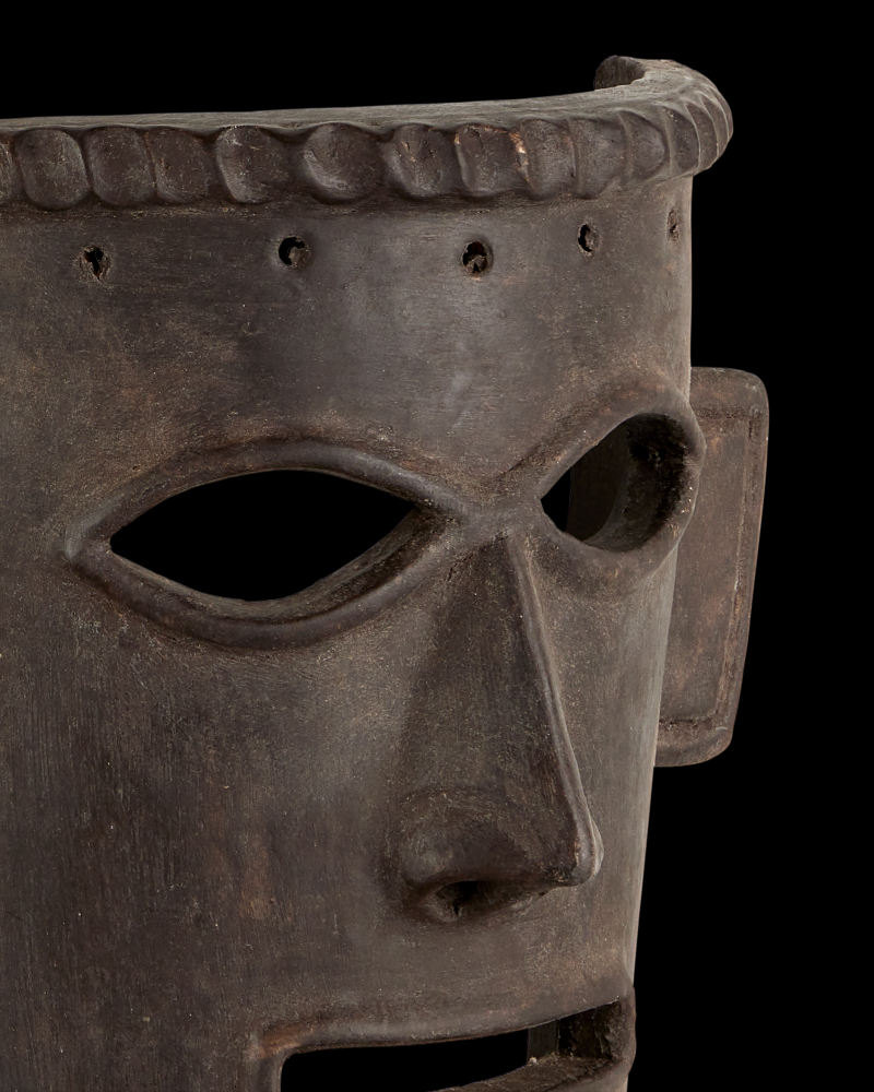 Made of clay, the Etu Black Mask Set includes two black masks that are medieval in their attitudes. The finish is rubbed onto the black sculptures so the clay shows through in spots to enhance the feel that these are aged artifacts. These are among our artisanal pieces that will be conversation starters in the spaces they will ornament.