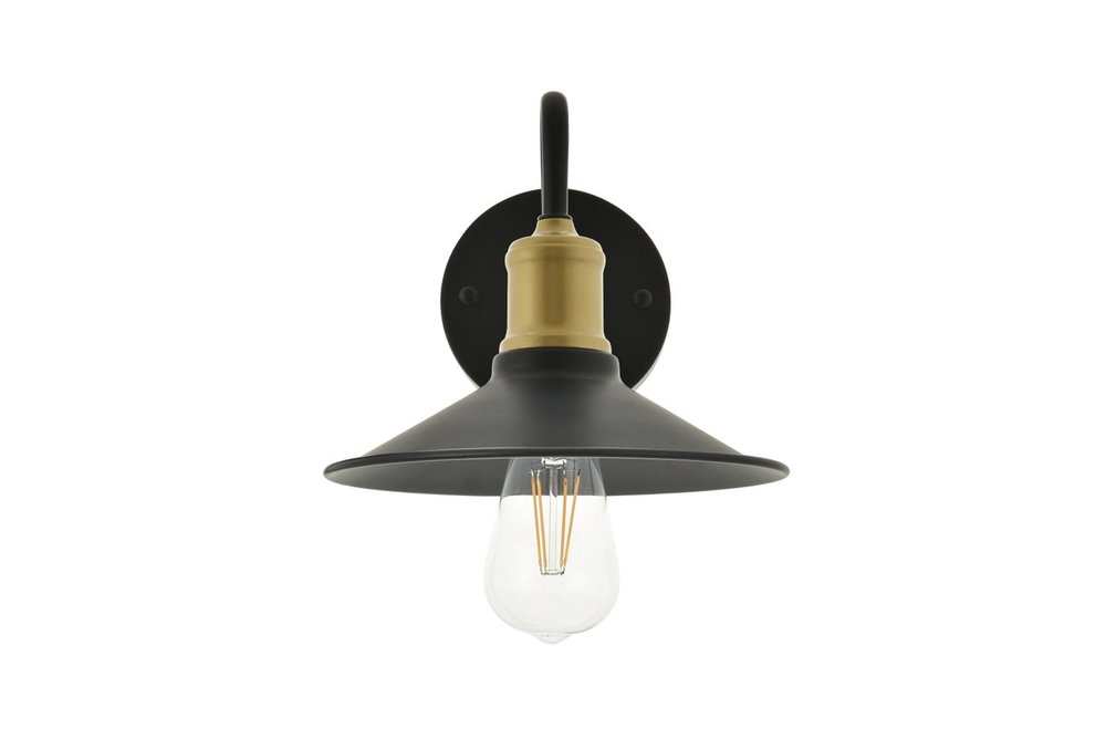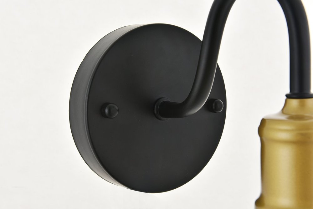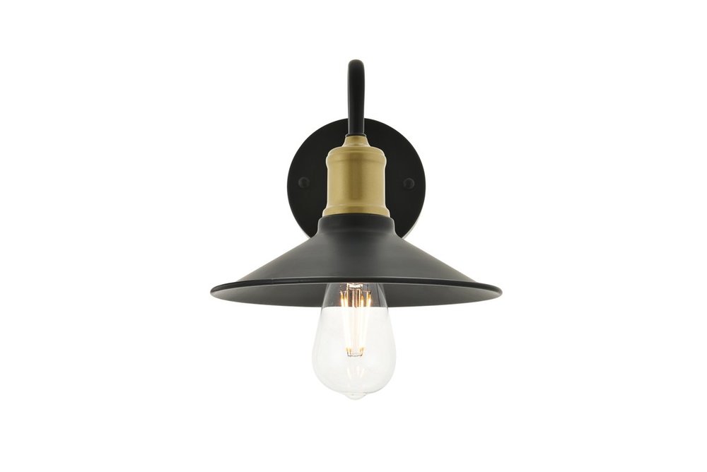 Two-toned brass and black finish wall sconce with a curved arm and cone shaped shade