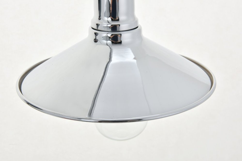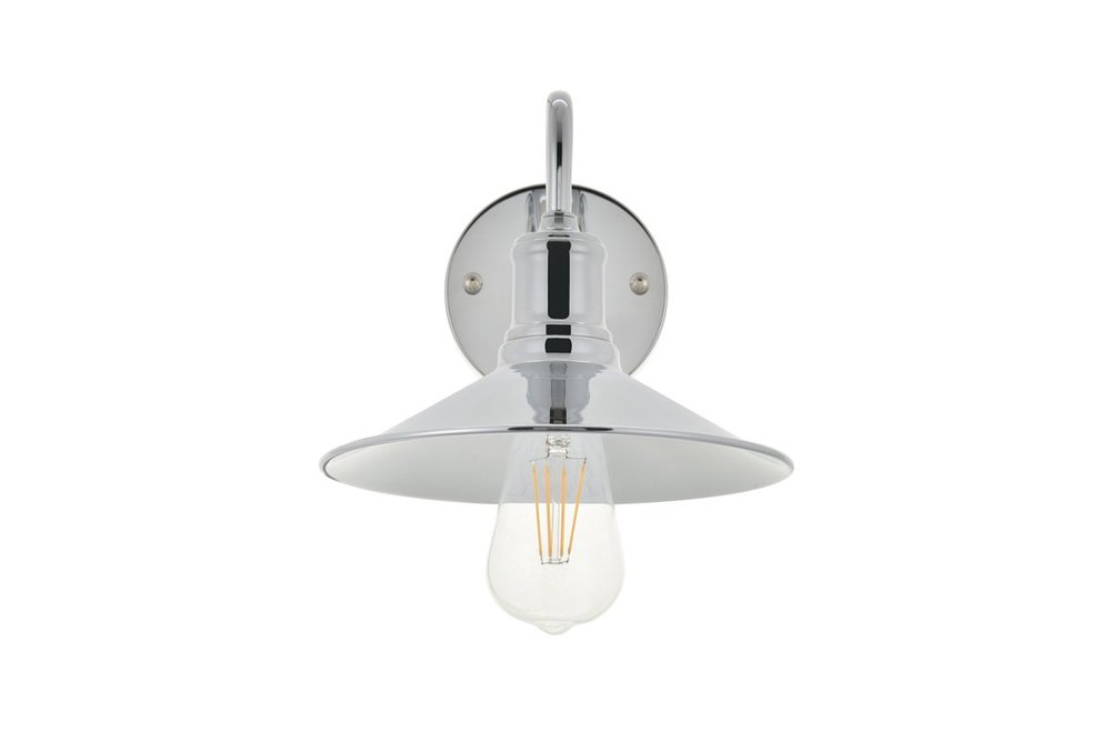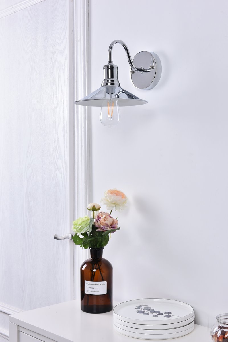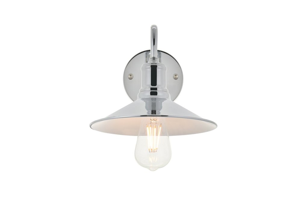 Chrome finish wall sconce with a curved arm and cone shaped shade