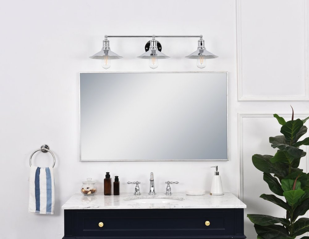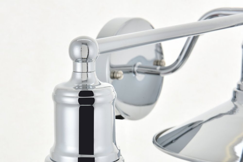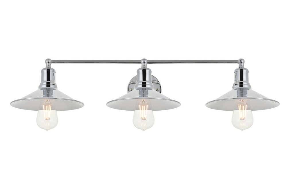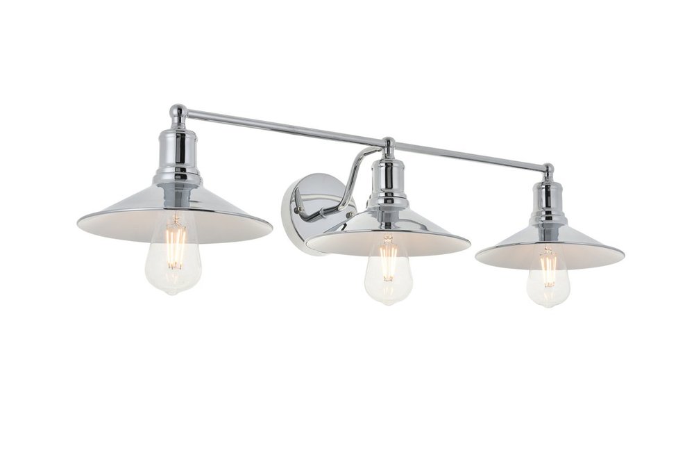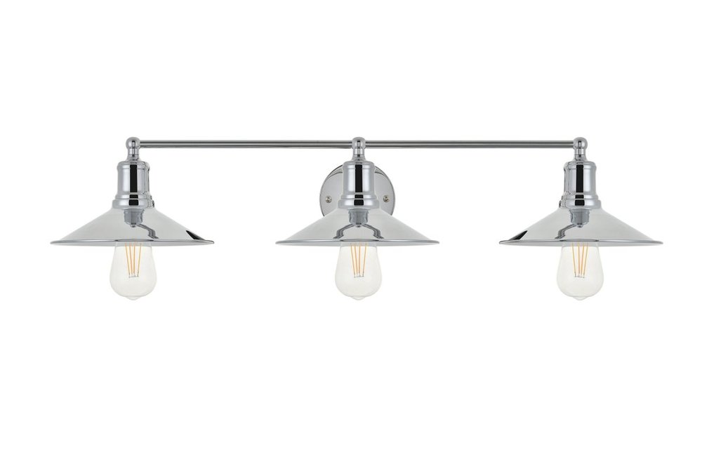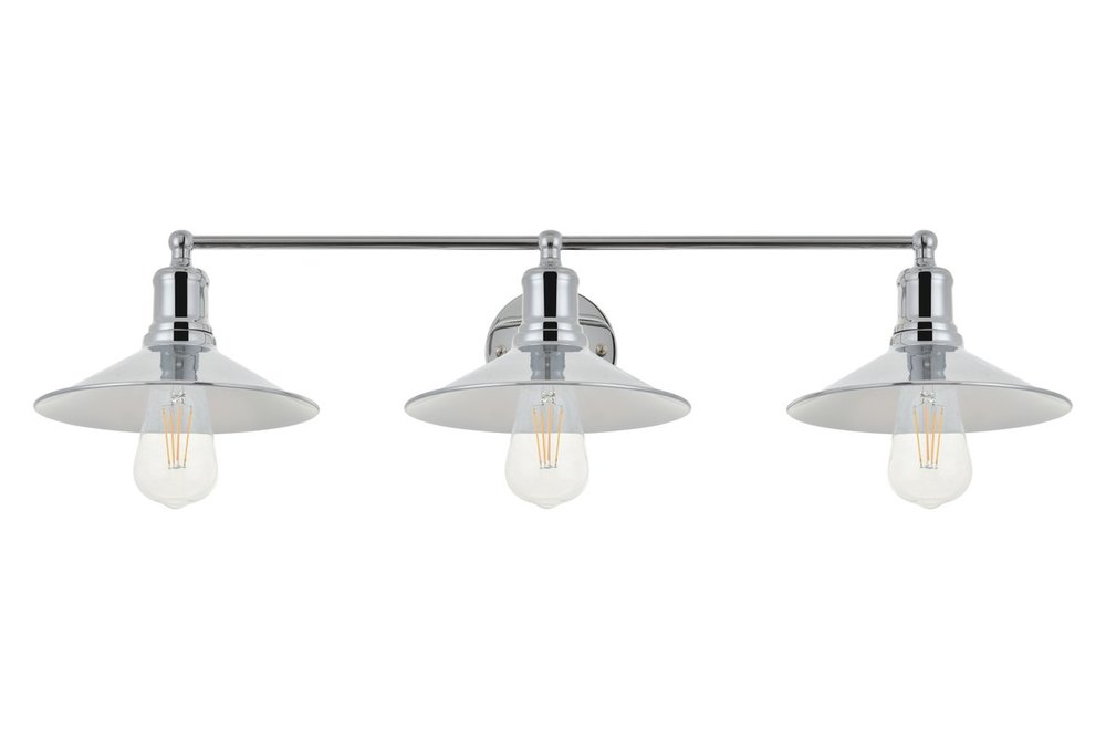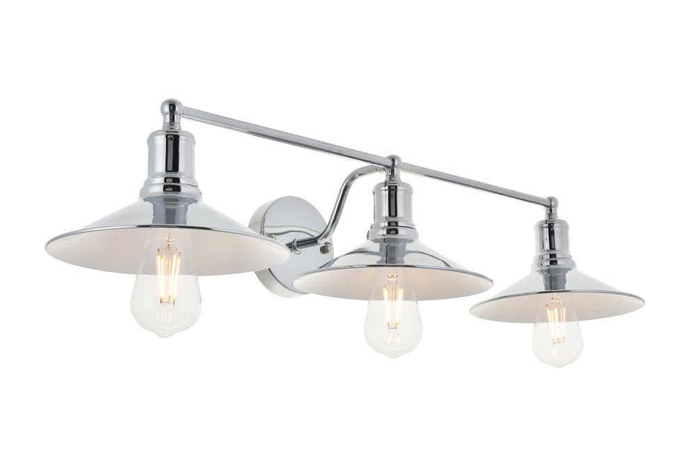Chrome finish 3-light wall sconce with a curved arm and cone shaped shade