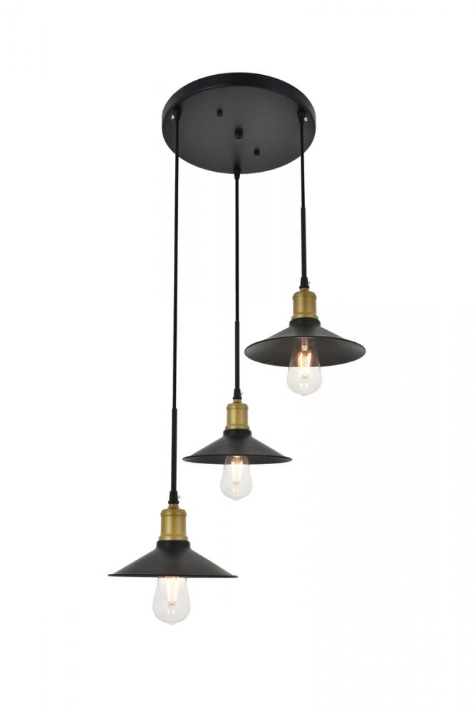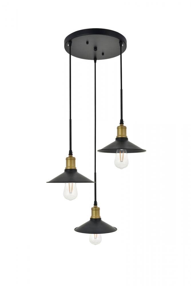 Two-toned brass and black finish 3-light pendant light with dome shaped shade suspended from a circular canopy