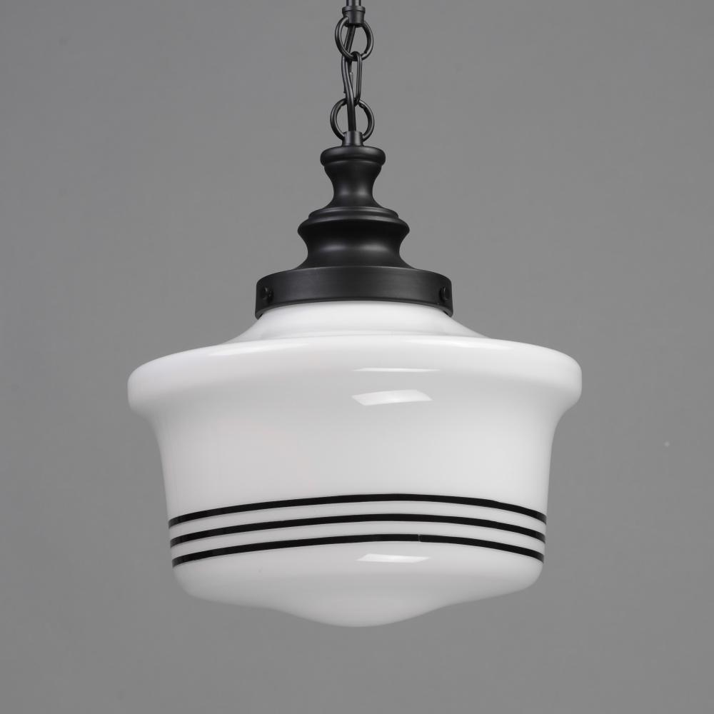 A refreshed take on classic schoolhouse glass pendants, this collection combines nostalgia with modern flair. The opal white glass shades feature repeating black stripes for a contemporary twist, while Matte Black tops and streamlined down rods add a clean