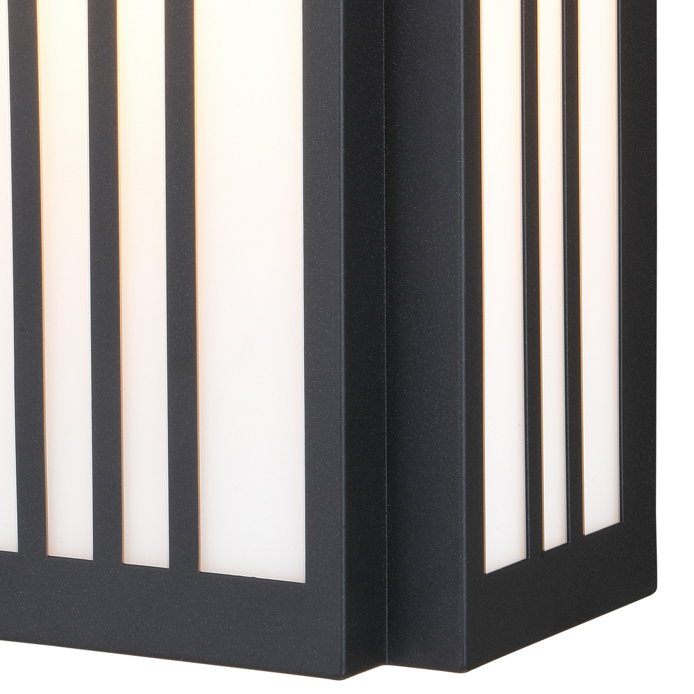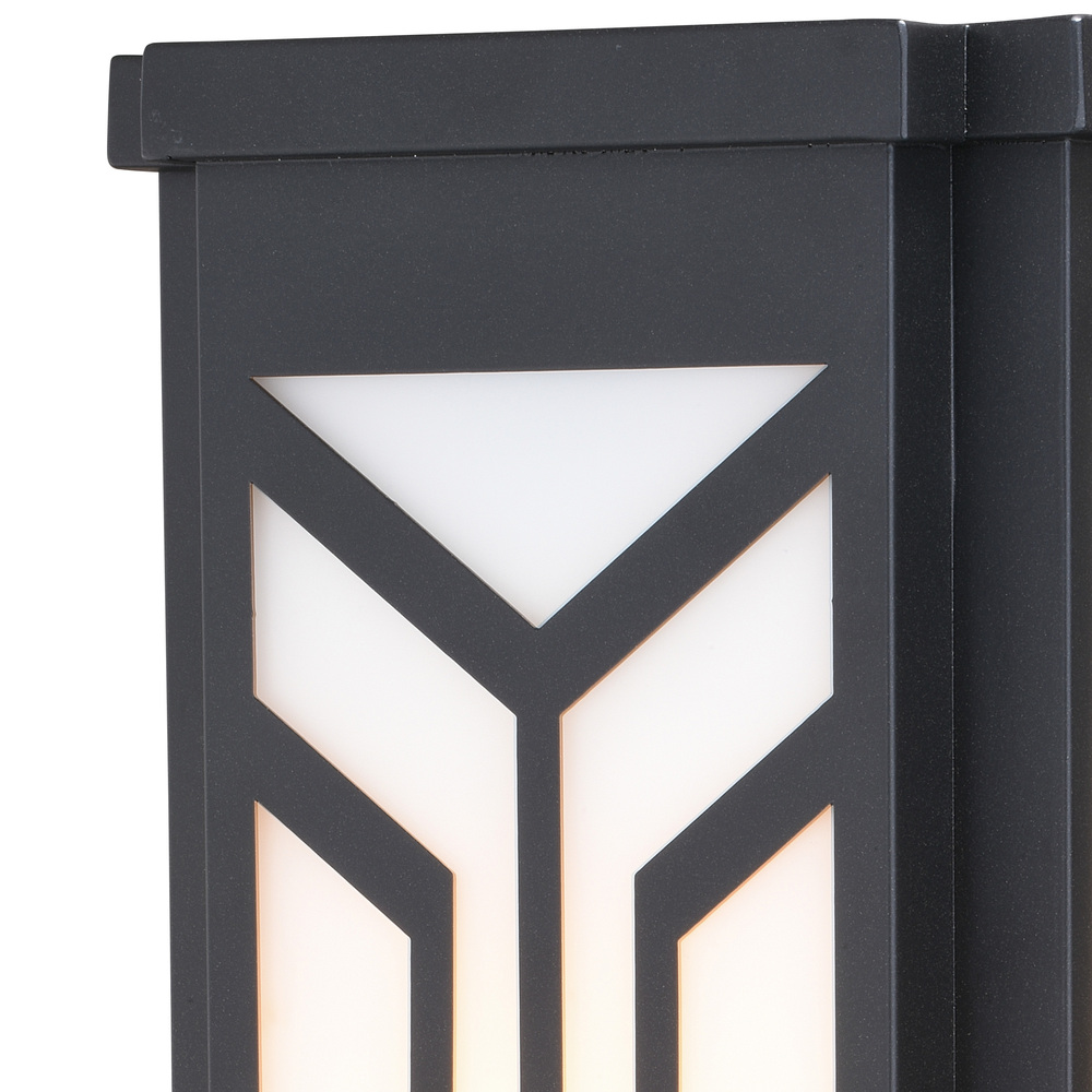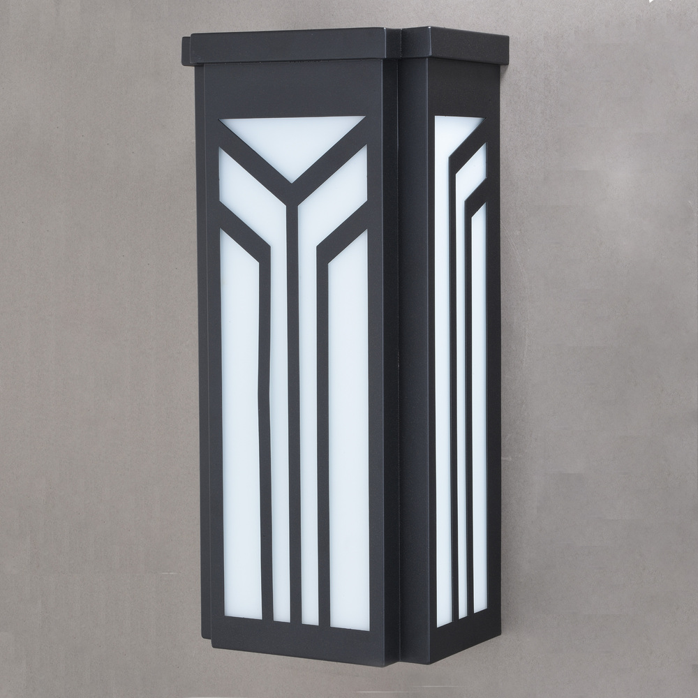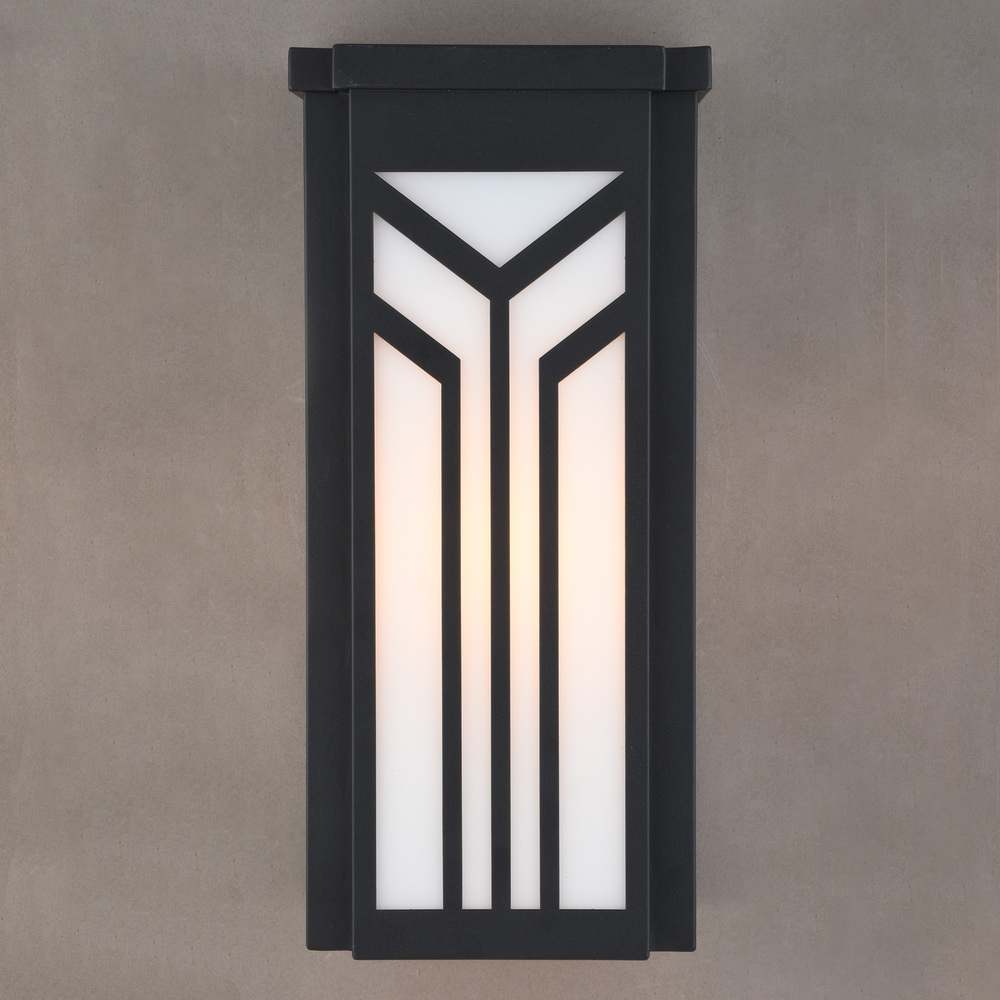 Trendy art deco styling is the focal point of the Evry collection. Graphic retro-inspired lines in oil rubbed bronze are paired with soft diffused white glass panels to create a striking combination. Use these wall lights indoors or outdoors; ideal for any outdoor space, entryway, hallway, or any other area of your home.