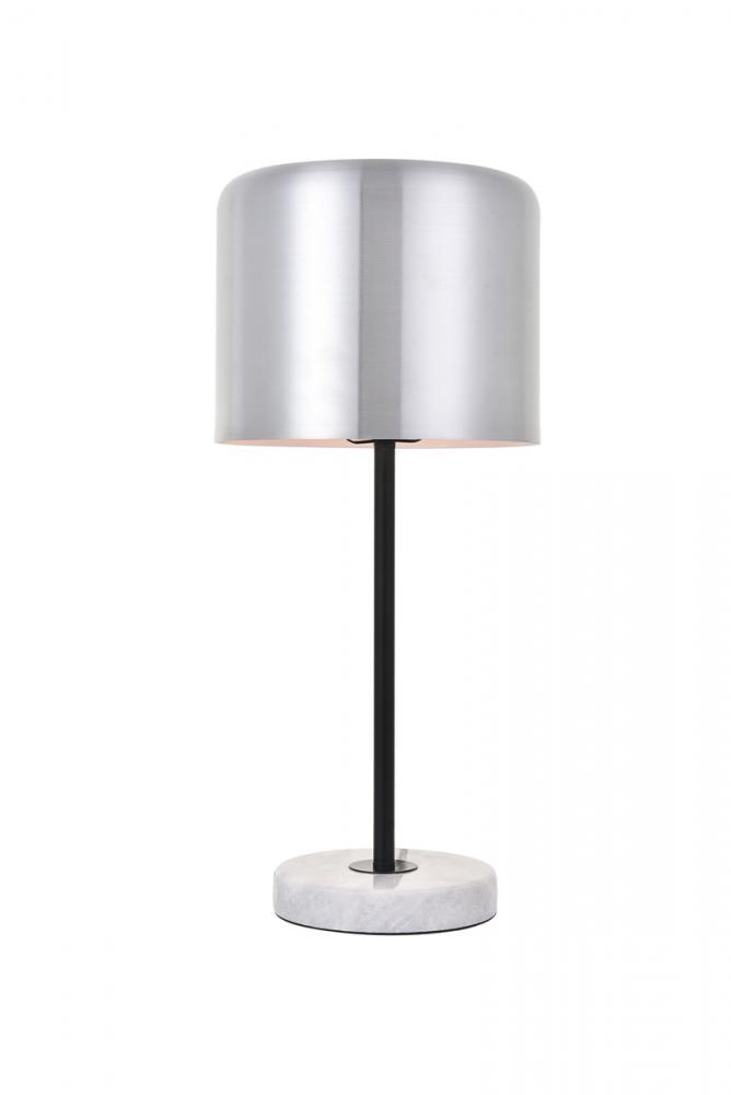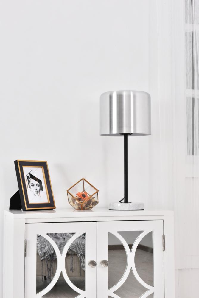 Contemporary brushed nickel finish table lamp with a cylinder shaped shade and white carrera marble base