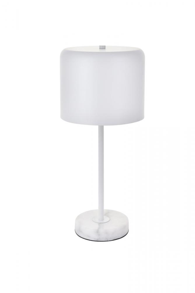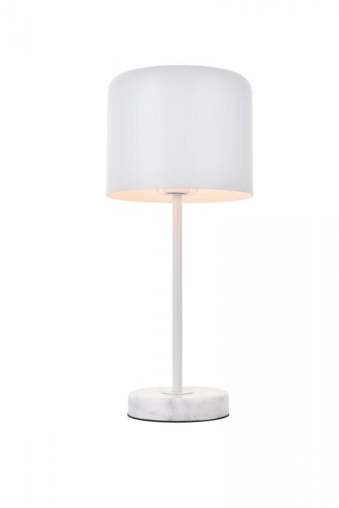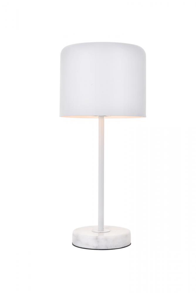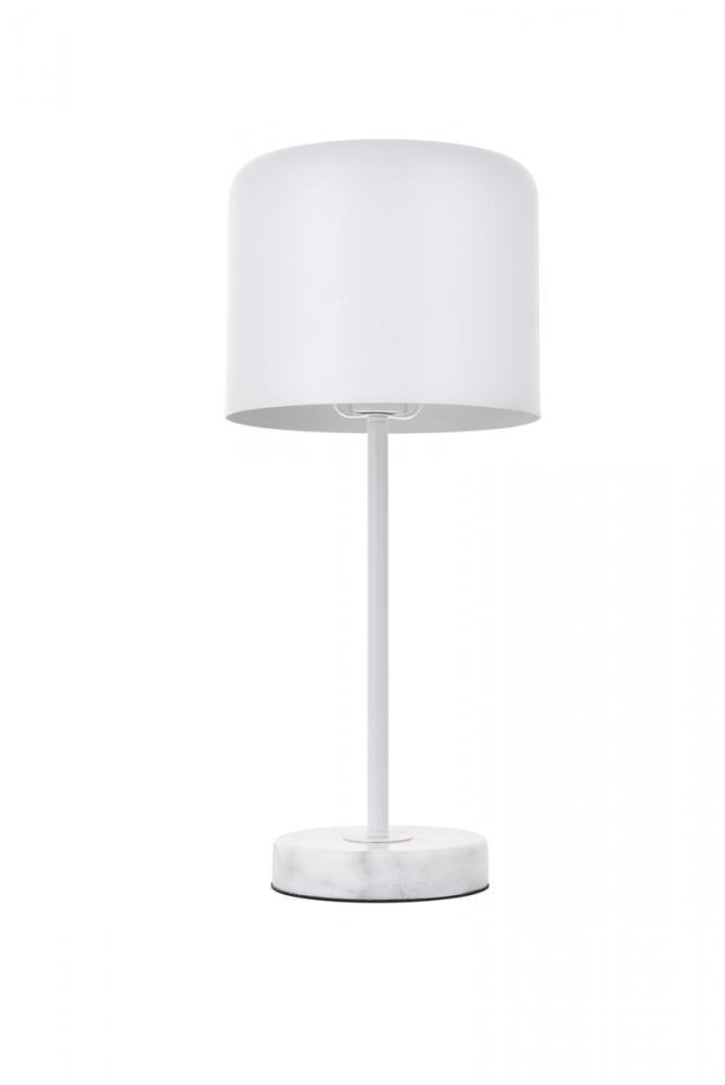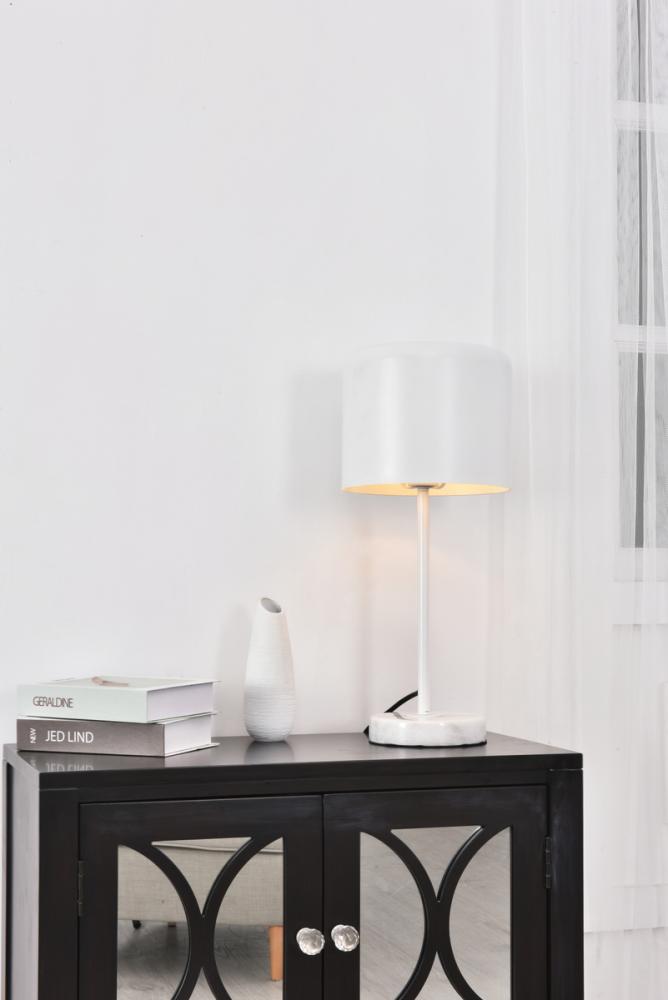 Contemporary white finish table lamp with a cylinder shaped shade and white carrera marble base