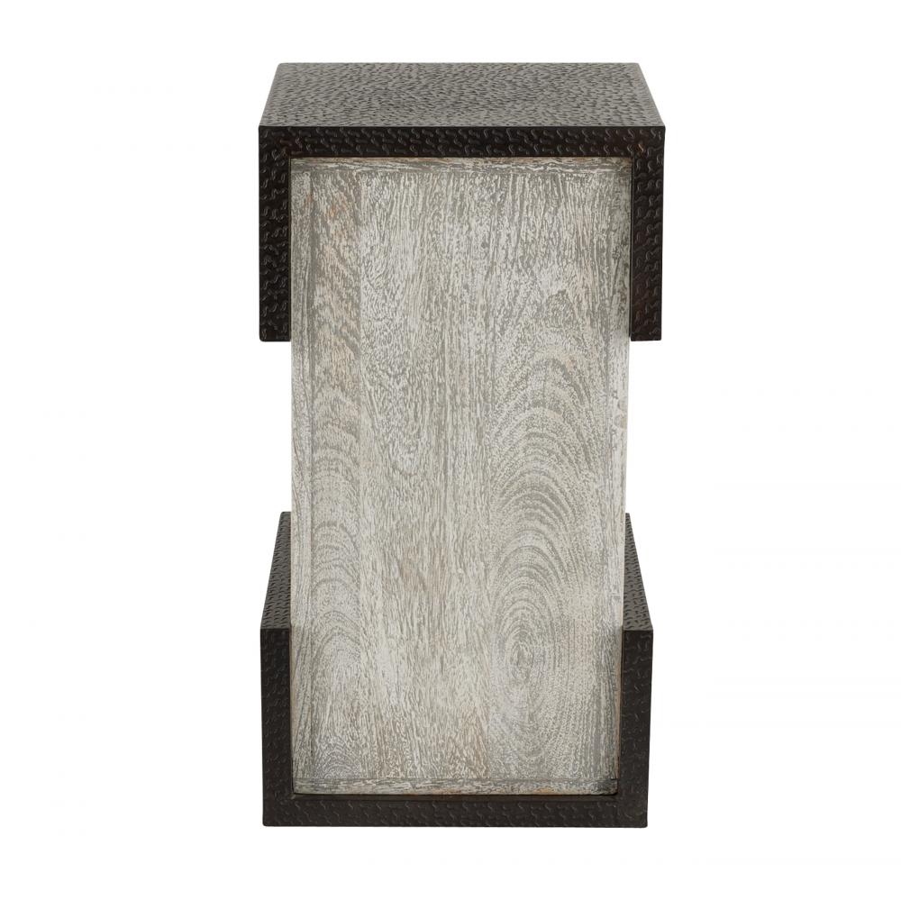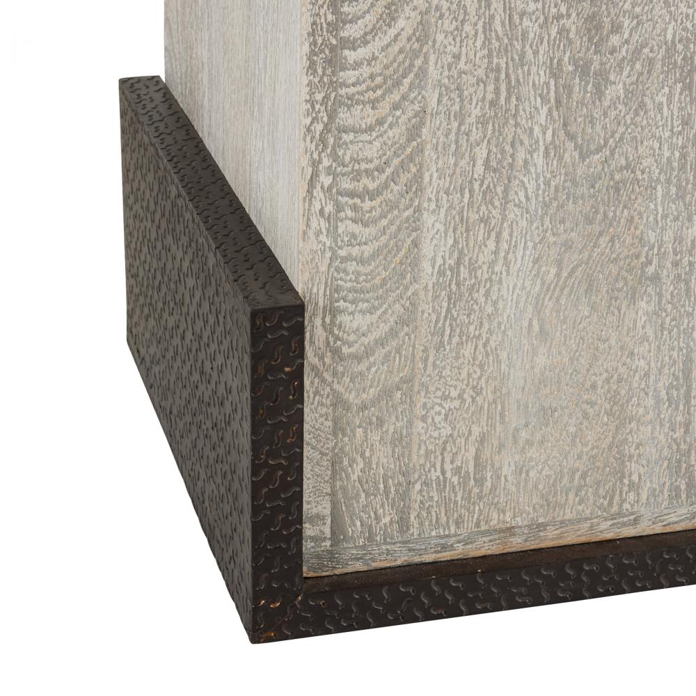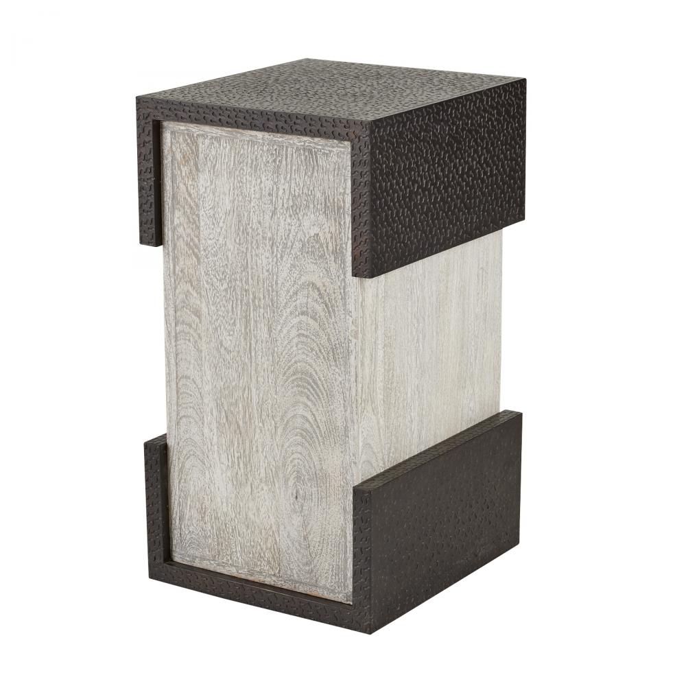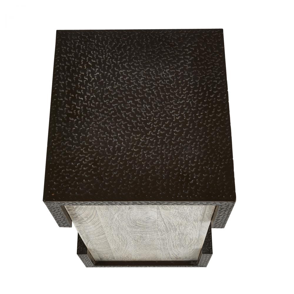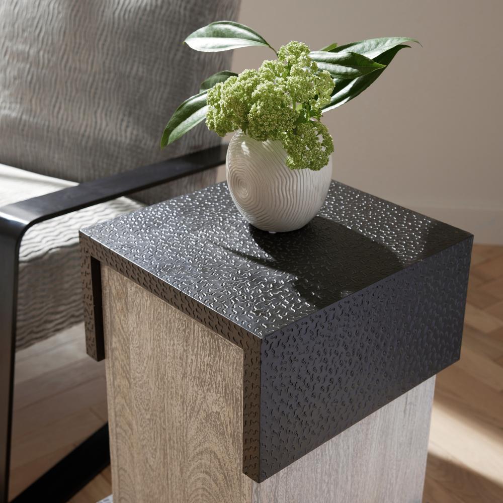 Clasp details solve the puzzle of making a simple form more impactful. This offset block style’s bronze brass clad accents punctuate a square base of smoke-hued mango wood. Finish will vary.