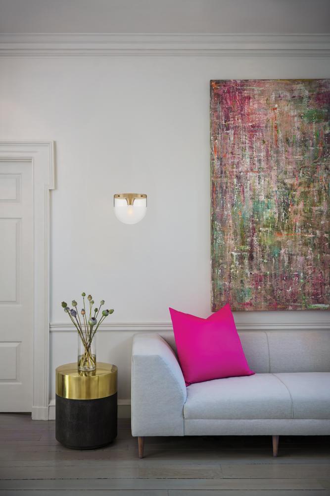 Beck's transitional style is reinforced by a smooth Lacquered Brass or Black finish paired with an etch-dipped glass shade offering texture and visual interest.
